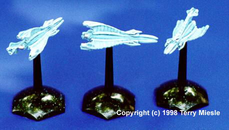 By Terry Miesle - copyright © 1998. Minbari War Cruiser: I think this was one of the easier miniatures as far as cleanup and assembly goes. As with all white metal figures, gap-filling superglue and accelerator are your best choice for assembly. The three main wings and tailfin can be attached immediately after cleaning the joint assemblies to ensure a broad, long area for attachment and proper fit. I don't worry about over-applying the superglue, excess can be sliced and scraped away easily with a chisel-bladed X-acto knife. There were no major difficulties in the assembly. Cleanup was minor, fit was average and the surface was mostly clear from blemishes. I printed out several pictures of Minbari Cruisers from the Babylon5 utility disks for reference. Leave the smaller "fins" off for now, they'll just get in your way when you paint. I left off the spiky arrays which go on the nose and upper rear body, too - they'll just bend if you put them on now. Clean these parts up, too - you'll paint them the same time as the body. I left the post off, too, although for some other cruisers you'll want to attach it early in construction. The space between the wings is fairly tight, and you'll need the space for drybrushing. You may need to drill open some of the little holes in the main body's ribs, too. Sometimes they are partially cast over. The primer is crucial for metal figures. I airbrushed flat white Tamiya acrylic for this task. After priming you'll see if there are small mistakes you can correct and either hand- brush some more primer or re-airbrush the area. I painted the ship with a hand-mixed light blue Tamiya acrylic. I just mixed flat white and flat blue until it looked right then airbrushed it. I also primed and painted the Minbari fighters at the same time. Let this dry for a day or two, then coat the minis with flat lacquer (Testor's Model Master (TMM) Dullcoat in a spraycan). Now: 1. Wash. I like to get a good heavy wash on my models, I can always lighten it up with drybrushing, and have a nice contrast effect. I found a good wash media for this blue can be made from thinning the top layer of TMM Blue Angel Blue enamel. It essentially is a thick pigmented thinner. You could also use blue ink. I haven't had much success using acrylics as washes. I probably diluted the top layer by half with thinner. This I flowed along the leading ridges on the wings, into the recessed areas in front and back, along crevices and along the "heat sinks" on the wings. Anywhere you want to provide shadowing. I also darkened the recessed rear area - it won't look right if it's too light. 2. Drybrushing - a saga in multiple acts. This was my first real experience at heavy drybrushing with acrylic paints. They're trickier than enamels, your brush has to be somewhat wet, and the layer you deposit must be thicker. For this reason I decided to use more steps than I typically would. Pay particular attention to the heat sinks and central raised areas on the fins. Essentially multiple grades of lightened paints are deposited on darkened areas. After the first drybrushing, I applied TMM Dullcoat. After the second drybrushing, I applied the stripes. 3. Stripes - the angelfish's marks of aggression. The stripes on a Minbari cruiser are striking. They're one of the visual triggers the ship designers are so good at on Babylon 5. I deliberated for a while on how to replicate that effect. After some trials I decided on the following method. I lightened the flat blue - probably close to half (by volume, not hue) with white. Then with a semi-dry brush I drew a line lightly where I wanted the stripe. I then could broaden the stripe along the leading edge and taper it toward the trailing. I tried this method on the fins, but met with failure, so I lightly scrubbed the marks off while they were still damp. I drybrushed the darker blue along the central spines of the fins and the leading edges of the wings and nose. Your paper will quickly have a large patch of paint which will let you maintain a semi-dry brush. The spikes can be painted the same color. ***Note*** with the Tamiya acrylics you'll need to clean your brush pretty often as it dries. Then dry it out on tissue before continuing. I found a "semi-dry" brush most effective - that took some practice. |