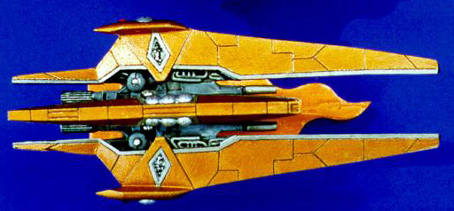 Bin'Tak Dreadnought* The long, flat, dagger-shaped Bin'Tak fits squarely within Narn design philosophies. The model is slightly shorter (5 inches overall) than the Centauri Octurian, with flat slab-like side hulls and a mechanical center section. Upon first viewing the kit, we all thought `damn, that's nice' and `it looks almost Vorlon.' It should take equally well to a G'Quon type color scheme or, like mine, a burnished metallic. The kit is 5 pieces: central hull, 2 side hulls and 2 hull extensions plus 2 bases and pylons. It's pretty long but fairly lightweight. Compared to the Octurian it's a feather, similar to the Primus in mass. I had a couple of problems with the casting. My side hulls were a bit warped, but I was able to bend them straight. One of the side hulls was cast poorly in the rear portion, too. I cleaned the area up as best as possible, but it's noticeable, there is missing metal. 1. Cleanup and assembly. Upon fitting the mini together out-of-the-box I noted a substantial warp in the side hull fit. This was partially due to their bend, but once those were straightened the problem remained. I tracked it to the fit of the central hull to the side hulls and a slight skew in the side hull slots. Since the side hulls are identical, just flipped for use on the other side, this small difference was compounded. The central hull didn't fit too well into the side hulls anyway, so out came the files and knives. I took a fair amount off the edges and had to thin the lip. I also removed some of the detailing to allow the central section to fit in the slot more tightly. Eventually I did get the fit the way I wanted. I marked one of the side hulls where it couldn't be seen (in the notch area) to remember which side was which. 2. Color Scheming This is an unusual mini, the side hull interiors have significant detailing and it's a pretty tight space. I wanted to do the central hull a different color than the side hulls, so I decided to leave the kit dissembled while I painted it. This dagger-shaped ship called out to me for a metallic finish. I thought a bronze color for the side and extension hulls with blue interior panels and a dark grey interior hull would be striking and quite militaristic, reminiscent of a Roman gladius. To accomplish this I first primed with Tamiya Flat White and followed with two airbrushed coats of Testor's Brass in the small bottle. It's a thick, glossy paint so make sure to thin it well and give yourself plenty of time between coats. It took several days to cure, after which I sealed with two coats of TMM Glosscoat Lacquer and promptly left it alone for several more days. Meanwhile, the center section was painted with TMM Gunship Grey and lacquered with TMM Dullcoat. 3. Details, Details... I painted the interior of the side hulls with TMM Light Ghost Grey (Tamiya Sky Grey is similar) to prepare for detail painting. I painted the blue sections Tamiya Flat Blue, then used the blue wash technique as described in the Minbari Sharlin review to deepen the color. After that, I drybrushed the area a slightly lightened blue to provide depth. I then sealed the areas with semi-gloss lacquer. I followed with drybrushed TMM Arctic Blue Metallic over the blue panels. |