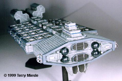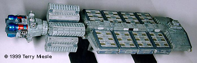 Poseiden-class Carrier Except that the mini is much larger, buildup and painting information is exactly the same as for the other EA ships. Look at the Omega and follow the same techniques. The only place I deviated from this is in the hanger area, where TMM Steel was used to paint the recessed areas, with TA greys as fill, and TA Gunship grey as framing. This was drybrushed with TMM Medium Grey. Other than that, it's exactly like the Omega or Nova. |