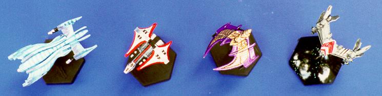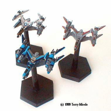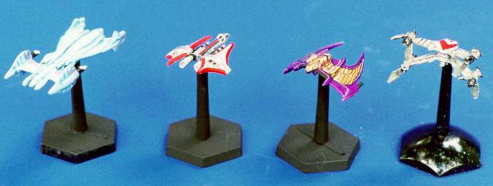AoG's Gorith and Rutarian fighters by Terry Miesle ![]() AoG's Minbari Transport and Starfury fighter by Terry Miesle ![]() Narn Frazi fighter by Stew Hunsaker ![]() Narn Gorith fighter by Stew Hunsaker Front View of Terry's Fighters Terry used various decal bits in addition to paint to mark these Thunderbolts. |