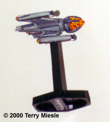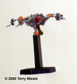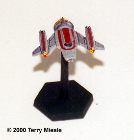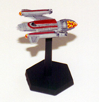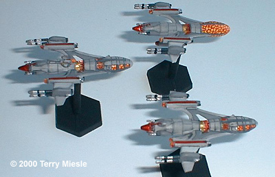 Drazi Cruisers: Sunhawk, Skyhawk and Strikehawk; and Sky Serpent fighter. In Babylon 5 the Drazi hold a special place. They're like the French during the twentieth century, an annoying ally. They're fractuous, aggressive, autocratic and jealous, but at the same time they have been ready to commit military forces when the Alliance calls. They have also had no reservations about acting behind the Alliance's back when they have their own agendas to satisfy. They are the definitive traders in B5, and seem to have less moral difficulty selling or obtaining illegal items than even the Narns. Of course their agendas hold sway over their actions, but they have been seen to bend under pressure when confronted with their own treaty violations. Their fleet vessels are also somewhat different from others in the show. Like the Centauri, they rely on large numbers of smaller, highly maneuverable vessels. Unlike the Centauri, they do not tie a fleet with several larger battlecruisers (though in the AoG game system there is a larger capital vessel). They also do not use fighters the same way other fleets do. The Drazi Sky Serpent is nearly the size of a light combat vehicle, and only one may be carried on a modified Sun Hawk, called a Strike Hawk. It can act as a picket or a strike vessel. The use of fast mid-sized ships allows the Drazi to escort commercial freighters without committing more expensive vessels. Several Sun Hawks will deter any raider ships, of that there is little doubt. The ModelsThe Drazi capital ships are 5 pieces: a main body, lower engine, two gun barrels and a small projection for the nose (two others are molded on). The fighter is two pieces, with the lower engine cast separately. The wings of the ships tend to either flatten or bend too much, so some bending will be needed to correct the angles – this is a gull-winged shape. No more than the normal amount of cleanup was needed, which means removal of some excess metal and filing the mold seam lines. I washed the pieces in the dishwasher (I built a LOT of ships), placing the small parts in a plastic mesh bag – which originally contained shallots, if I remember correctly. This worked surprisingly well; typically I have used a toothbrush and dish soap, which takes a lot of time. The ships were assembled with cyanoacrylate (CA) glue, the small gaps were filled with CA as well. I also glued the stands to the ships at this point. PaintingI primed with two coats of Tamiya Sky Grey. This was sealed with an acrylic gloss coat (Future floor polish). I applied a light black wash with Testors Model Master (TMM) flat black along the engine nacelles and some other raised details. This step probably isn't absolutely necessary, but can provide some definition. Other grey colors were used as panel colors, Testor's Acryl (TA) Gunship Gray and a couple Gunze-Sangyo grays. Panel lines were added with a Micron 0.005" drafting pen. Excess pigment was washed away with a bit of saliva and my little finger. Several lines can be done at a time this way. More than a few lines, and the ink will be too dry and permanent. These lines are very fine and elegant, and have elicited many comments. |