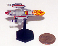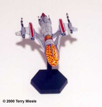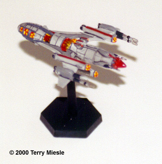 Before proceeding further, a layer of TA Dullcoat was applied. Bee ButtsThe Drazi ships have an unusual glowing reactor as their aft sections. To me these have always looked like bee abdomens, particularly the Skyhawk with its cage-like structure. To achieve this effect, I first painted the area flat white. Over this I painted two coats of Tamiya Flat Yellow. Atop the yellow I used Tamiya Clear Red in a pattern evoking yellow bubbles floating on a red background. This same technique was applied to the engine nacelle fronts. The framing for these areas is TA Gunship Gray. Stripes and HighlightsI used Tamiya Clear Red to apply the red stripes. This was a mistake. Though the clear red is easier than a flat paint to apply lines than flat paints, it is still difficult to handpaint very straight lines. I should have used decal film. A sheet of red film and a paper cutter would have shaved hours off this project. I applied a layer of TA Dullcoat to the gloss red stripes. The engine nacelles and guns received various metallic paints, including TMM Gunmetal, Aluminum, Steel and Chrome Silver. ConclusionIf I were to start this project today, it would probably take me half as long. Though the techniques are basic, implementation of some of the methods I’ve described are not easy and I did struggle at times trying to figure out how to achieve the results I could see in my mind. I’m very happy to see AOG producing more ships seen on the show. We will soon have all the designs from Babylon 5 available as metal miniatures. Together with the original designs, there are enough minis to fill a good-sized wall cabinet. I'll continue to do paint-up work for AoG, so expect to see new articles soon. Many thanks to AoG for providing review copies. |