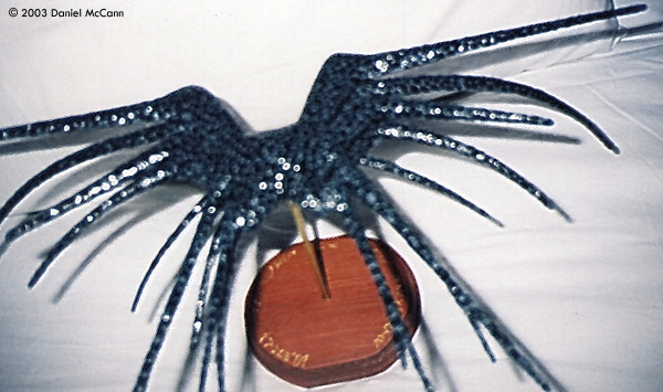 Once you have gone over the model area once with glue you will notice than the veins lie flat and did not protrude as they should. The remedy to this is to go over the whole area again at least twice to get the raised vein feel. Alternatively you could use micro-balloons. If you make a mistake or decide that your first attempt at veins was crap-tastic, you can easily remove then with a pointy bit of a toe nail clipper. Simply stick it into the blot of PVC glue and gently pull, you should be able to remove a whole patch of veins in one go, if you have connected them together properly. This will usually rip off even the paint that you have put on, but it easily fixed by another coat. Then you can reapply the veins, and believe me the more practice you get the better your veins become. Once the veins are all done on one or all of the sub assemblies, then the fun began. I took a toothpick and a bottle of mascol, and dipped the toothpick into the bottle. Once I had a large enough droplet on the toothpick I just simply dropped it into the pits between the veins. As you can see this was trying work and it can take an age to finish. Also do not overreach, just do one are of the sub assembly at a time;one spine for instance will be sufficient. Having covered one spine in mascol, I would then do something else like more veins on another subassembly. Once the mascol had dried I then would get a medium brush and just cover the whole (now dried) area with the dark grey paint. Now here is the trick, its best to remove acrylic paint when its still a little damp, if you leave it on to dry you could end up taking to whole paint off along with the mascol. So what I recommend to do is to wait until is gone slightly thick and then just peel off the mascol in bits. This will avoid undoing all your good work. Now you can leave the paint job to dry properly. The next stage is more complicated. I originally tried to just paint around the veins, thick enough that the black underneath would still look good. It didn't, so I decided to use a similar technique for the black paint job as I did to apply the mascol. So I got my tub of black paint and dipped a brush in until a large blob of paint was on the brush, next I dropped it into the pits in between the veins on one side. I know this sounds very sloppy but it does work, you get the whole area filled with black and it gives an uneven level of paint in each pit so the irregularity of the veins work is accentuated. Now I would strongly recommend that you let this paint dry thoroughly, I usually did one set of spines and then let the thing dry off for a day. The reason for doing this is simple; I used a lot of paint that didn't dry very well, and although you will notice if you attempt this method, that the top layer of the paint will be dry, it will still be quite moist underneath this little skin. Moreover I would also warn you that when you handle the model be careful not to touch the barely dry paint job as you will leave huge fingerprints in the dry layer. Also the paint will have a tendency to "spill" out over the pit in the veins, this is normal and although it may ruin your grey veins, it is easily repaired with a little grey paint and a small brush. Final Assembly Once the paint job had been left to dry it was time for some touch ups. I began by buying the smallest paint brush I could find, I think it was an 000 type brush. Then I began the repair work, or as I call it super-detailing. I traced over the veins that were partly covered in black paint and connected them together. This also had the advantage of allowing me to control the thickness and thinness of each vein, something that was hard to accomplish with the syringe and glue. Once that was done for each major subassembly, I then turned my thoughts toward construction. This was achieved with the excellent advice of the Starship Modeler forum members, and Erin Lantz in particular. It was he who advised me to use small piece of coat hanger wire to reinforce the joints. This level of construction is difficult, as I had to be careful not to damage the paint job. Still, with a little patience all was accomplished. I began by drilling a small hole in the smallest subassembly, to allow me to mount the model on a rather fetching brass rod. I made sure I dry fitted this rod so that I would not damage the model if I had to re-drill the hole. Next, on the other side of this subassembly I sanded down the two little holes on the model - the holes were still there, but the slight bumps were now no more. Next on the second largest piece, I sanded away the little "nipples" which were designed to aid attaching this piece to the smallest. Unfortunately these little nipples are no use whatsoever. They had to go, and once they did the whole area was nice and smooth. I discovered that I didn't need to reinforce this joint, as the surface area was large enough to adhere well. So Now I had two of the main pieces joined together, all that was left was the largest and final piece. This was more difficult as the surface area here is much smaller, so I sanded away the surface a little bit and I added a small tiny hole. This was done by hand with a drill bit and patience. I did the same on the second piece. Once done I added a a paperclip that I cut to size, and glued it to one of the holes. Next I added lots of super glue to both areas and place then on top of one another, making sure that the holes lined up. Once done I held the model firmly in place until it was completely glued together. I noticed after this that the top levels paint job was a little damaged, all cover in fingerprints and such. So I got out my black paint and retouched the effected area. Once this was complete I had to mount the model on a base. I decided that I should decorate the base. I did this, rather fittingly I thought, in the runic language that the shadows themselves used. I downloaded the font I wanted from some obscure site, and away I went. I use