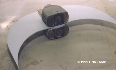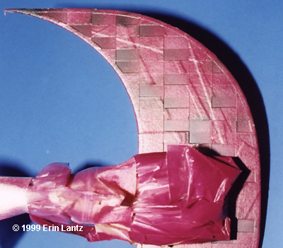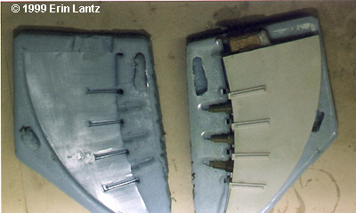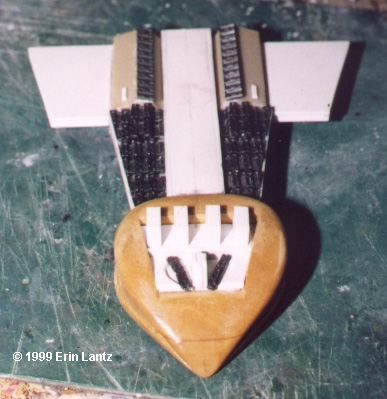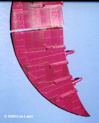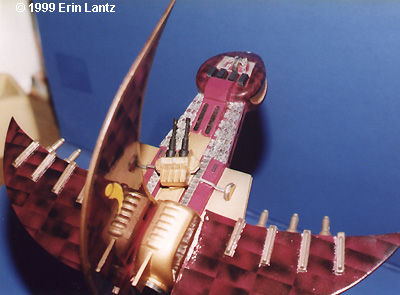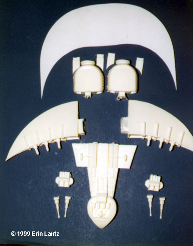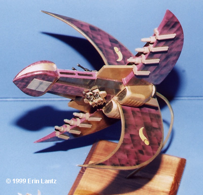 Acting as the front line vessel in the Centauri Navy, the Vorchan is the epitome of Centauri design. Used as fast strike ships, their small size, high speed, and heavy firepower allow the "fan heads" to get in and out quickly. As the Alliance soon found out in season 5, this ship is much more powerful than it looks. Twin cannons on both top and bottom mounted turrets and 6 wing-mounted cannons allow the Centauri to more than leave their mark. Gravitic mines are carried internally, and can be released anytime during battle. While actually a corvette or medium cruiser, this ship would put up a good fight against any capital ship, and when used in the typical Centauri raiding pack, it's downright deadly. After seeing them throughout the show, I decided that it was my favorite "metal" ship of the show. Since very few, if any, reference pics are available of this ship, I decided to base my scratchbuild on the AoG mini, sizing my creation 5 times bigger. First, I bought the ONE Vorchan AoG mini I could find and photocopied the pieces before assembly. Placing each piece on the glass individually, an enlarged copy of the piece was made to use as templates for construction. Using artist's 3M brand spraymount, I mounted each copy onto a piece of 1/16" styrene. After cutting out each of the main pieces for the wings, I decided to save some time and locate some ready- made engines. Searching the shipyards known as my wife's kitchen, I came upon some beautiful engine blocks in the form of a Vanilla flavoring bottle. It had nice bumps on the sides and was perfectly sized. The cap would act as the afterburner cans, saving me the hassle of having to scribe in grooves for the can details. A search of my scrap parts box turned up the radiator grills for the top of the hull. T-80 tank track links from an old Dragon kit were now a radiator array. After searching for what seemed forever, I finally realised that everything else would have to be scratchbuilt. Oh well, the kitchen can only provide so much..... The next step was to figure out how to do the distinctive nose of the ship. I started one in resin, but soon found it too hard to shape right. I kept shaving off too much. I finally bought a piece of basswood and carved it out of that. Using my belt sander, I slowly got the shape right and started detailing. All nose detailing was made from bits of styrene and resin, with a few track links thrown in for balance with the hull. Since I didn't have very good references, I decided that the hull should have heavy heatsink type radiators all over it; those big guns must produce some serious heat! The hull was built in pieces of styrene and resin. A central rectangular styrene box was made to act as the spine. This piece would be the attachment point for the rest of the parts, so it was filled with resin for strength. Next I built the right side hull from styrene, and detailed with plastruct half I beam. I made a mold of this piece and then cast a copy. Both pieces were then glued in place on either side of the "spine". The wing supports were made by sandwiching sheet styrene and cutting to size. These were then glued to the hull in the correct places. The front part of the hull where the neck starts to narrow was made by shaping some resin into some triangular pieces that fit and then glued on. The bottom of the hull was covered with thin, small grooved styrene sheet to replicate corrugated hull plating. Next I glued the completed nose to the end of the hull with JB Weld. It isn't coming off, gang! It came off 4 times before I used the JB Weld, but it's on to stay now. The references showed a bridge type structure at the base of the nose, so I fashioned one from scrap resin blocks and unused pieces of hull side castings. It was at this point that I realised I had forgotten the mine bay doors, so a door was made from sheet styrene and glued to the bottom of the nose. Next I cut and glued the tracks onto the upper hull. Details were added on the wing supports using some resin parts made for another project and some solder. Main hull completed, I set to work on the engines. Taking a Vanilla bottle and making a mold of one end of the bottle made the engines. The cap would serve as the afterburner, and the bumps on the side made for good details. After the first resin copy was made, I carved intakes to fit it from basswood. The intake was then epoxied to the "engine", and the "afterburner can" was drilled out. I made small engine exhausts to put inside the cans, and then glued em in. Once dried and sanded, a final mold was made of the engine block. Remember those pieces cut out earlier? Each half of the wings were glued together with Tenax on the back edge and left to dry for a week. Once dry, I took the front face piece and wedged it in between the top and bottom to make the final shape of the wing. Details were made from sheet styrene and square styrene rod. Once finished, a mold was made and copies cast. Stacking and gluing sheet styrene and then detailing with resin doodads and styrene sheet and rod made the turrets. The guns were made from progressively smaller styrene rod. Of course, molds were made of all these parts after completion. If it weren't for rubber and resin, none of my projects would ever get finished. Simply cutting two 1/16" thick styrene sheets to the correct shape, and then sandwiching them together with Tenax made the main vertical wings. The edges were filed smooth and then sanded to final shape. Final assembly brings all of the subassemblies together. Each engine was mounted to the vertical wing with superglue, then reinforced with JB Weld for strength. The small winglets on the engines were made and cast in resin and then mounted at this time. Next I made a small "mounting bracket" to fill the gap between the front of the wing and the rear of the main hull. After carefully aligning the hull to the engines, I glued them together using 5 minute epoxy, using brass rod supports to hold the wei