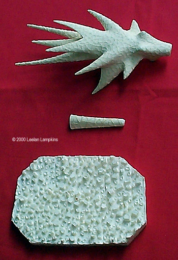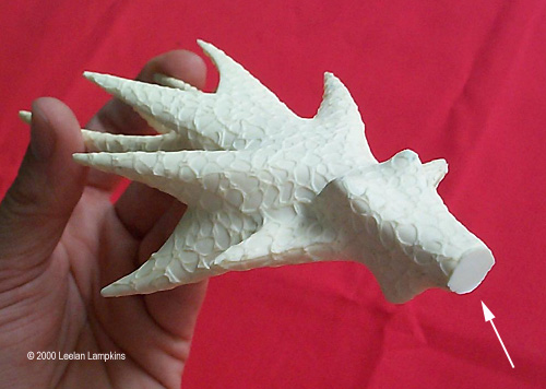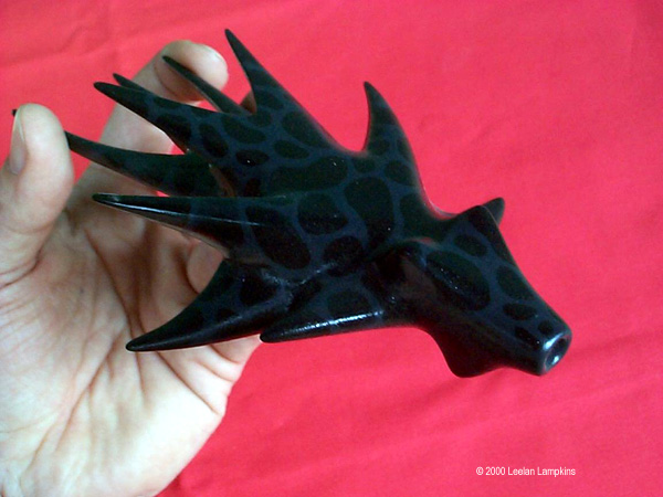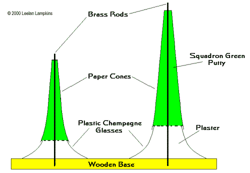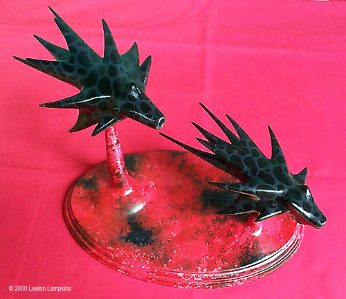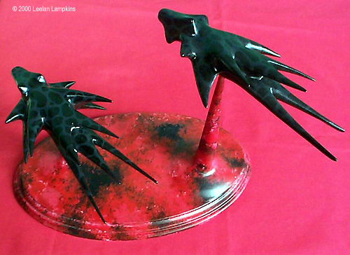 Now to painting. Kip suggests using Black Metallic as the basecoat and Anthracite Gray Metallic for the veins. I couldn't find these colors. I used black and a personally mixed gray, very dark with a touch of silver. The veins could be drybrushed or carefully wetbrushed. Weather to taste or not. Seal it and you are done. You can do the above and have a great kit. I chose to go the extra mile to make it my own. I ground and sanded the vein work off two kits. (Kip reacted in horror, "You sanded them SMOOTH???") [I don't think I would do this again - especially after rewatching "Revelations" again which contains the fighters first appearance.] But I wanted two Fighters with individual vein patterns, not identical twins. And I loosened up the pattern a bit in anticipation of reproducing the pattern on the mini versions which come with the Battlecrab. I did not use the kit base. I went for the look of Hyperspace as seen in Babylon 5. An oval wooden base, some brass rod and two plastic champagne glasses are the materials I chose. (I took no pictures but here is a drawing to give you the idea). I trimmed the bells of the glasses to flow more smoothly into the wooden base. Then I filled them with plaster and stuck the rods through them into the wood. I made two cones out of drawing paper to add height to the champagne glasses. Then I used more Squadron Green to fill the cones and smooth the bells into the base. After a long sanding session, I sealed the base with primer. Then I hit the structure with two or three coats of Krylon Triple-Thick Crystal Clear Glaze. (The fumes are MURDER. Open a window or do this outside!) Another coat of primer revealed the smooth shape that I was after. To paint the clouds of Hyperspace, I used a basecoat of pink and sponged on three darker shades of red. I then sponged on some black and retouched with red. A few coats of Crystal Clear (regular) and a semi-gloss clear and it was done. I am pretty happy with the result. But there are some things that I would do differently today. In fact, I was about to change the veins again after entering the finished model in the Atlant Model Expo/SciFi Model Con II. I took it there to show some StarshipModeler's who were coming to the show and entered it as an afterthought. I won two First prizes. Coulda knocked me over with a feather (- ask Phule.) Verdict: Buy this kit. If you are a fan of B5 and the Shadows, you have got to get all of the kits from Howling Wolf Productions. The sculpting is excellent and the shapes are perfect. Aside from the clean-up all you need worry about are your own crazy ideas. |