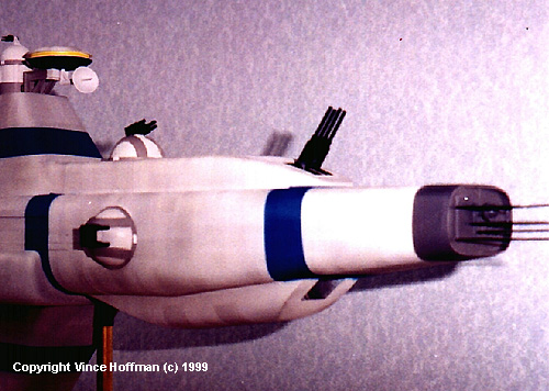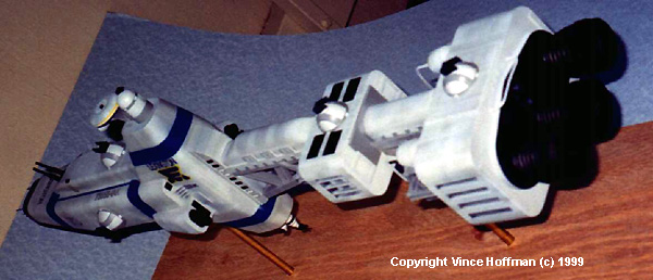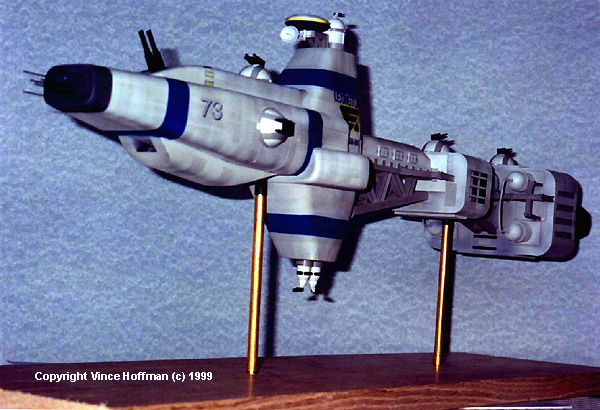 Construction of the gun turrets was a 4 step process... first, the basic half-circle shape was cast in resin and the bottom ring and top gun base was added using plastic strip. Then the whole thing was cast again to make a second master. More than 10 of these were created before I found 5 that were perfect (the others go in my greebles box). The guns were then built up using tube and strip plastic. The fourth step was to make the arched pieces on either side of the gun. This shape had me stumped for a while and I almost gave in to just painting them onto the turrets. They were created by using the original master glued to the end of a brass rod and pressing it into a piece of heated styrene. this gave me a perfectly shaped piece of plastic that would fit the compound curve of the turret exactly and was the perfect thickness. I then carved out 2 pieces, chose the best one and cast it in resin 10 times, 2 for each turret. Painting the model was a chore since most of it had to be assembled before painting was started. First, all parts were temporarily glued on and any fit problems were taken care of. All the details such as the turrets, bridge assembly, and engines were left off since they would be painted separately. First, the whole model was given an overall coat flat black enamel paint. This black undercoating would allow me to bypass using a dark wash later by creating recessed shadows in the light grey paint that was to come. Light grey paint was chosen as the primary hull color, and airbrushed over the surface of each hull piece according to which direction the panel lines were going to go. This created light stripes which was the first step in creating the complex pattern of panels. Next, a slightly darker shade of grey was mixed using the original grey as a base and used to highlight the myriad panel lines. The panels were masked by using my flexible mask technique outlined in the tips and techniques section of this website. Multiple passes were made using these masks. After the panels were done, all trusses were painted dark grey and smaller hull details were painted. The model was then set for several days to allow the paint to cure. Then all of the blue stripes were masked using low tack drafting tape. Medium blue paint was used for all the stripes with a very dark grey around the nose. At this point all the painting was done and the whole model was oversprayed with acrylic gloss to help the decals to adhere. I made decals for the ship's identification markings, Earth Alliance logo, and windows. The decals were made using Print Shop and printed using 720 dpi at twice the scale then reduced on a color copier to create very crisp lines and colors at a small scale. It took me several trips to the copy shop to get the decals perfect. This model was started in August 1998 and finished February 26, 1999 with a 2 month haitus around Christmas (whew). My thanks to Jack Wendt for his help on vacuum forming, Brian Dainty for his tips on resin casting, and my wife for her atomic clock precision with the 'on-off' switch on the vacuum former. Now, where do I put this thing ? |