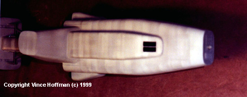 The model was built in 3 sub-assemblies, the foreward hull, hanger section and engine section. The main hull in front was carved from balsa wood because it was too large to fit on my vacuum former. The towers, upper and lower hull protrusions and the hanger were all vacuum formed using .020 plastic. The towers were reinforced on the inside with extra card plastic. The engine section, reactor section behind the hanger, and the structure behind the tower were built up from .030 plastic. These items could not be vacuum formed because they provide structural integrity to the model. The trusses were built up using Evergreen plastic shapes and painted before installation because of all the inside corners. These pieces must fit perfectly because they support the weight of the rear half of the model. After each assembly was completed they were dry fitted to each other and checked for fit and alignment then shimmed and sanded until everything was nice and straight. At this point the model was mounted on a 12" X 3' board which eventually became the display base. The engine parts were cast in resin. The engine bell is a 2 part mold. The engine was created using the main casting with a second piece applied to the front to make the straightened exhaust. The smaller nozzles went on the rear section of the main hull. The saucer shaped part off the tower is a mystery. I believe it is the bridge, but speculation aside... it was created with 2 parts, the first part is a 2 step casting, the top textured area was cast separately, sanded and shaped to the right size, then the dome was cast around it. I had very good results with this process. The top and bottom are attached using a small strip of plastic to create the recessed slot around the circumference. |