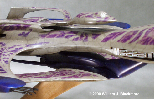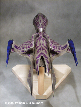 The model was cast beautifully with little flash or voids. The parts fit together with ease. The instructions were also adequate, but could have used a little more clarity. At any rate I built the kit easily and without any sort of special techniques, with the only exception being that I drilled out holes in each face of the major matching parts of the fuselage and tail sections and inserted brass rod to increase the mechanical strength of the joints. I used CA glue to smooth out and fill the joints instead of model putty. It tends to sand smoother, and lasts longer than the putty, and is a lot more durable. I primed the model with Floquil brand Railroad Grey Primer. I buffed the entire surface with 5-0 steel wool and then a tack rag. I then went through a whole range of paints trying to find the right combinations with my airbrush to achieve the effect of the living skin of the ship. My opinion is that it cannot be done accurately this way. After several tries I soon decided that decals were the only way to go. I paid an enourmous amount of money for this kit and I wanted it to be perfect. I checked out several of the custom decal houses and they all wanted about $ 400.00 to do the job, and it would take a number of months. After the model sat for several months, I managed to contact a guy who had image files that gave me a clear idea of the what the surface of the ship looked like. After a few days of banging away on the computer, I had a 3.5 disc that I took to Kinko's and printed my own decals on clear decal paper. I sealed each sheet with a bit of Testor's Glosscote, then went to apply them. Before I did, I decided that I wanted some depth to the surface of the model. To achieve this I first painted the model with Model Master Light Grey. Then I used medium grey pastel chaulks to draw the viens on to the surface. After a day of drying, I applied several light coats of Tamiya Clear Smoke, which gave the model some depth and allowed one to still see the viens below. I then applied several coats of Glosscote. I buffed the model with a tack rag between each step. After polishing I cut each of the colored decal sections apart and applied them to the model, using a setting solution, instead of trying to apply each panel as a whole. |