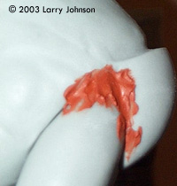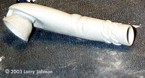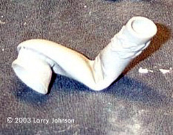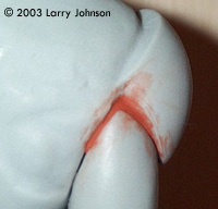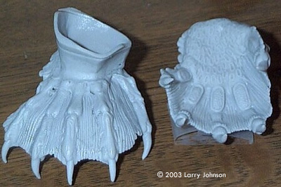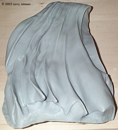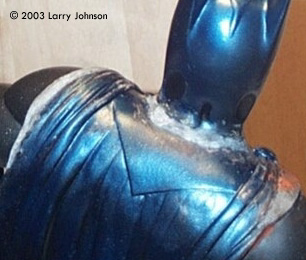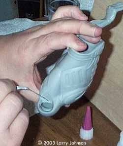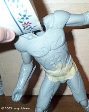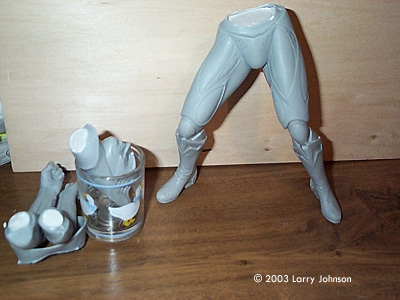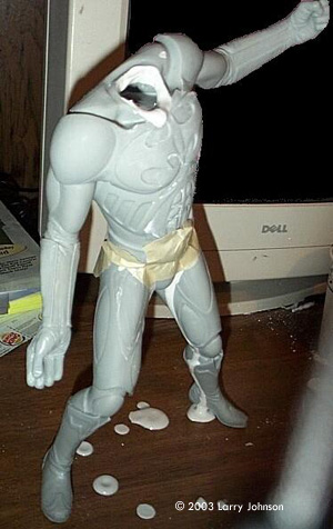 Important Note! Vinyl has memory. While heated it will always return to its proper shape but if cooled while held in a new shape, the new shape BECOMES the proper shape! Say we have the figure's arm in hot water to trim the flash off and we are inadvertently bending the hand at the wrist. Take a look at the hands of Horizon's Spider Man. In addition to another look at the flash on parts, we can see how delicate these hands are. The hand or a finger could be easy bent while holding it to trim the flash. If it should cool while you are holding it like that, the hand's new position will become permanent. Now I know we all see a usefulness for this but not now while trimming so just be careful! It's a good idea to have all the parts on hand and test fit as you trim for two reasons. One, sometimes a little flash left on the part might not interfere with the fit and provides additional surface for bonding. Two, since we have a danger of reshaping the parts, it's good to test fit as you go to make sure nothing has deformed. Construction As mentioned, vinyl figure kits generally are of few parts and tend to go together easily. Good kits require little or no seam filling. Just a few special notes need to be observed. Assembly First of all, regular model cement does not work on the vinyl plastic of these kits. CA (super) glue or 5-minute epoxy is required. A combination of both can get you a quick hold to fit the part and long term, durable bond as the epoxy dries. If you wish to fill the model with plaster for reinforcement (see below) you will want to use epoxy, especially if the figure has feet or legs in poses where the weight of the upper body may cause shearing forces that CA glue can't handle. Assembly is usually easy, as most vinyl kits have few parts and good fit in general. This Revell kit and most Horizon kits have this good reputation. Test fit the parts to find where they mate and apply a little adhesive. Then join the parts and secure them with tape until dry. Be careful with CA glue as it bonds nearly instantly, the thin stuff at least, and you don't get a second chance to position the part. And ask me one day how many CA fingerprints had to be sanded off the Batman when I was done putting it together. On later models, I used a combination of epoxy and CA. Some epoxy carefully applied and then a small amount of CA around the lip of the mating site can be the perfect bond. The CA glue holds the part and the epoxy dries at its leisure for a stronger bond. Alternatively, you may be able to reach the joint from inside after the CA bonds and spread some epoxy over the joint. Let epoxy dry completely. Another option is thicker CA which does not dry as quickly. Using this will give you a second or two to make sure the part is in the correct position, the zap it with some accelerator. Reinforcing Reinforcing the model is necessary to protect it from deforming. In hot weather, if you don't have an air conditioner, the model may sag and deform as the plastic softens. Heat is our friend - heat is our enemy. Two methods are commonly used - filling with plaster and filling with newspaper. Batman was filled entirely with plaster and let me tell you - Mistake! I cut out circles in the legs and shoulders to allow the plaster to flow into all areas of the figure. As you can see, I did not use epoxy and had gaps in the mating pieces. This lead to a plaster mess that had to be cleaned off the model. Fortunately plaster comes off easily. The other way to reinforce the model is to fill it with newspaper. Cut (or tear) strips of newspaper and stuff them in the model part. Use a dowel (or a paintbrush handle) to stuff the newspaper in and completely fill the part. I do recommend filling the feet and shins (or whatever parts come in contact with the base) with plaster. This gives the model some lower weight and balance. Keep in mind, assembly and reinforcing are not necessarily separate steps. Some parts need to be filled before assembly, others after. With Batman, I filled his arms and head separately. Then the arms were added to the body and the body filled with plaster. All-in-all, filling entirely with plaster, as I have hinted to up till now, turned out to be a nightmare. Let's compare all the previous steps to see how this nightmare occurred. Look at Batman fully assembled. In this picture, Batman is nearly finished, his head left off for the addition of the cape later after painting. He is filled with plaster to reinforce him against deforming and he is bonded solely with CA glue. The weight of the plaster filling the upper body is putting a good deal of shear strength against those bent knees and CA glue does not resist shear strength well. After this picture was taken and Batman left standing till the next day's work, I found him in the morning, his body laying face first on the table separated from the legs, one of which was actually still standing. In one comic, Batman got his back broken - never his knees! It took epoxy and brass rod to repair the damage and make him strong enough to stand again. A painfully learned lesson and I no longer use only plaster to reinforce vinyl models. I now use plaster in the feet and shins and then the rest is filled with paper. Plaster may be stronger but it's heavier. Seam Filling