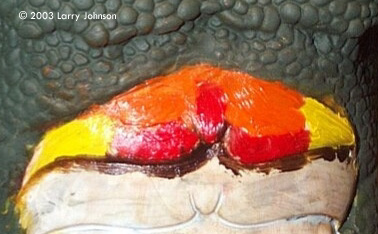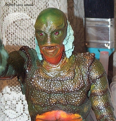 Next came the blue, in this case Tamiya acrylic Metallic Blue. The gunmetal areas were masked and blue was airbrushed over his cape, cowl, gloves, boots and shorts. A wash and drybush were applied with the same paint darkened with gunmetal and lightened with silver. Okay, lacquer, acrylics, ahhh yes, enamels! For the bat symbol on his chest and his utitlity belt I used Testors Champagne Gold Enamel in a rattle can, in keeping a theme of metallic versions of the comic book colors, gold for yellow. The belt received a wash of black for the contours. Continuing with enamels, the face was pre-shaded with Testors brown and then the cowl was masked and Testors flesh was sprayed. A light wash and drybrush followed with a little pinkish flesh drybrushed on the lower lip. Batman was very easy flesh-wise, showing nothing but his lower face, and good shaded flesh makes or breaks a regular human figure. The eyes came next and as figure people will tell you, eyes also make or break a model. I don't pretend to be good at eyes yet but I can at least put something in that doesn't look cross-eyed. Batman's eyes are another medium - gel pens. White went first followed by green iris and pupils made with a Sharpie black marker. Batman's eyes won't win any contests but I think they are alright. Figure modelers will often simulate the starburst effect of the iris with different shades of the primary eye color either painted carefully or using pens or pencils. You will most definitely need a magnifying glass to do good eyes! This picture shows Batman's simple eyes and the brown pre-shading but is very blurry so be warned (it was late, sorry). That was basically a step-by-step painting guide for the Revell Batman, you see that conventional model paints work on figures (again given a good acrylic base). Oils are a completely different way to paint. With conventional model paint, we paint and then use washes and drybrushing to show depth and light and color variances. With oils it's blending. Oils Again other people have extensively discussed oil painting elsewhere so I will just provide a brief overview. Oil paints take days to dry and therefore you can work with them for a long time. I am told that oil paint never truly dries and a little dot of turpentine will make dry paint pliable once more. So since it takes so long to dry (forever) we can blend oil paint right on our subject. Here's more examples of oil painting and blending with the Gillman's back. A stripe of brown followed by some tan spots and then the basic olive green. Now dab - dab - dab! Here is Gilly coming along. Conclusion In conclusion, although vinyl kits are almost all out of production and becoming harder to find, the secondary market (eBay) carrys a lot of these old kits. Horizon is the company for super heroes, Screamin' covers the Star Wars market, GEOmetric Star Trek TNG and AMT covers Star Trek TOS. Monsters, classic and modern, are covered by all the above companies. I can't help you with Anime but they are out there. As for quality, you can't go wrong with Horizon, although some of their earlier figures redefine boring with regard to pose. I have not built any GEOmetric kits yet (although I have 4), but they are quite excellent molding wise and fit looks promising. Screamin' products need a little more work. Their models tend to have surface blemishes and fit issues but then they are the prominent Star Wars guys and they do a lot of 1/4 scale kits if you like BIG! ERTL, with a few Star Trek and Star Wars subjects, are very nice in fit and molding areas but tend to look nothing like the subject in question. I can recommend the Spock model, however. With generally simple construction providing a three dimensional canvas for the artist, vinyl figures can be very rewarding. |