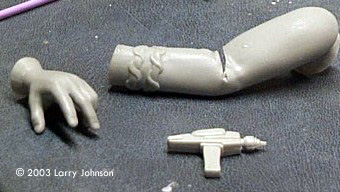 The cape was another issue and one of my first, semi-successful, ventures into epoxy putty. The gaps between the shoulders and neck where the cape joins the model were huge. I filled the neck gap with epoxy putty and smoothed with a brush dipped in alcohol. For the shoulders, rather than go for a smooth flush seam, I used the epoxy putty to build the cape up so it flared over the shoulders. - No you don't see blue paint there! No right-minded modeler would glue or putty a painted piece! You gonna believe me or your lying eyes? Altering Remember talking about being careful when trimming parts while heated as they can deform? This can be a useful method of modifying a vinyl model. I have a Horizon Captain America and the figure is posed with a fist in the air. The fist is horizontal and I wish to make it vertical and put an American flag in it. Heat the part in warm water and then twist the hand while warm. It should move easily and I want to be careful to keep the wrist looking as natural as possible. And folds are wrinkles that develop should be minimal and can be explained as the twist clothing. This ERTL Spock model demonstrates the technique. Now while hold the hand in the new position, run it under cold water. The part is now permanently modified. Obviously this technique can only be used for small changes. For example, if you took a straight arm and wanted it bent 45 degrees, the plastic would simply fold and not hold its shape. In this case, cutting and repositioning the part is necessary. You could combine the two methods by cutting out most of the elbow and then heating and repositioning the arm, then filling in a new inner elbow with epoxy putty. For example, this ERTL Spock figure is pretty nice but I want to convert it to a Mirror Mirror Spock. One of the many modifications will include altering his right arm and hand to hold the phaser that comes with the kit. Here we can see the cut made from the inner elbow and the arm heated and bent and cooled to be slightly raising the phaser. It only needs a little filler to make it complete. The hand still needs the fingers modified to hold the phaser. Mounting I almost forgot to mention, you'll want to mount you model on a base. The best way to do this is to drill holes in the feet and stick metal rods up into the legs and let the plaster harden around it. You can also glue the rods in place with CA, epoxy, or epoxy putty in a post construction mounting situation or if you do not plan to use any plaster. Then, epoxy the rods into holes drilled into the base to hold the model in place. Use a temporary base while painting to hold the model by and then mount the model to a permanent display base. Another option instead of rods is to puts bolts into the feet from the inside. The head of the bold will be in the leg and the screw will be sticking out the bottom. Then plaster, epoxy or putty the bolts into the place. Now you can simply bolt it to the temporary base with nuts, unscrew the nuts when finished and bolt it to a permanent base. Obviously, you will need oversized recesses in the bottom of the base to accommodate both the nut and room to get pliers or a wrench in to unscrew it. The head of the bolt and the screw pattern will also give the mount "bite" in the plaster so as not to work loose with handling and traveling to all those model shows. Finishing Finishing consists of priming the model, an important step with vinyl, and painting in the medium of choice with the paints familiar to most modelers and oils, normally only used by modelers for washes. Priming Vinyl must be primed in acrylics in order to later accept lacquer and enamel based paint. Some people will argue that enamel doesn't affect vinyl but many people will corroborate that a model beautifully painted with Testor's metalizer without an acrylic undercoat will begin to melt. I take no chances that enamel or oils might be safe and I undercoat with acrylics always. I don't want to find out even years later that enamels break down vinyl unless I am doing a performance model of the Wicked Witch of the West. It's usually a good idea to prime the model a different color than the plastic. This lets you see any spots you may have missed. Batman is modeled in light grey so I primed him dark brown to show any spots I might have missed. A little sanding (remember those CA fingerprints?), another coat of primer and he was ready for painting. Painting Once primed in acrylics, you can use any medium normally used for models to paint vinyl figures. For descriptions sake, I will divide painting between conventional, the mediums we modelers normally use, and oils which are a different beast altogether. Batman was painted conventionally and for an example of oils, we will use the Horizon Creature from the Black Lagoon kit. Conventional