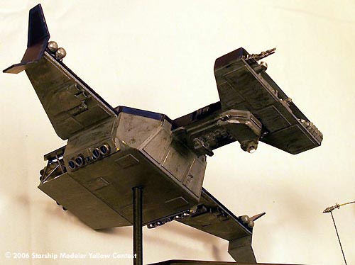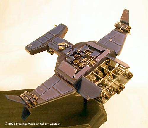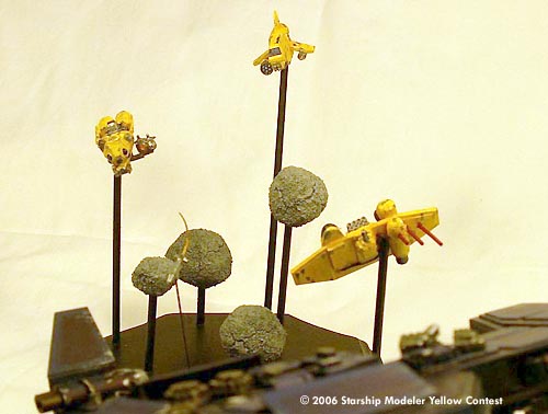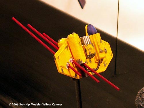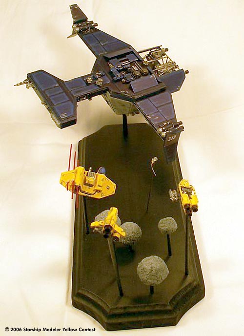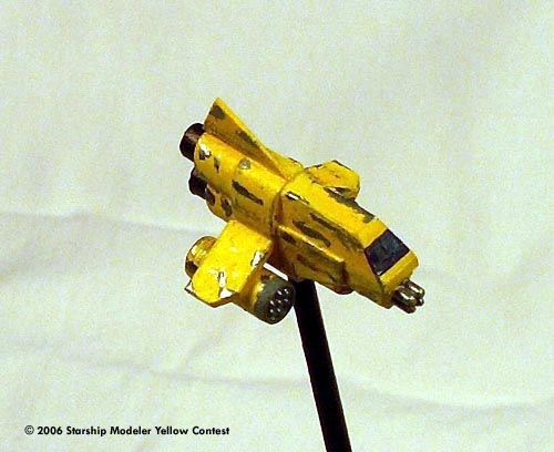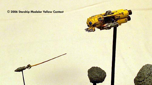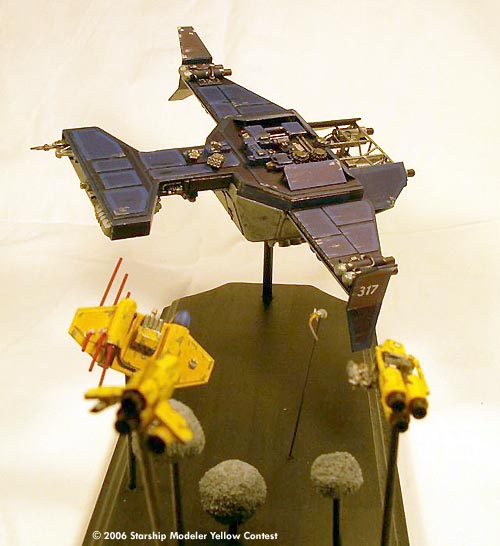 All the ships were built out of styrene sheet and rods, detailing (greeblies) was done with bits and pieces from various models, mostly from leftover warhammer 40,000 bits. The asteroids are made out of styrofoam covered in fine sand. The diorama was painted with Games Workshop paints; sunburst yellow as a base for the pirates and midnight blue for Betty. All the ship designs are mine, I've obviously taken ideas from various sources but designed the ships myself. Most work went into Betty, she took about three weeks to build. All in all I spent about a month on the diorama.