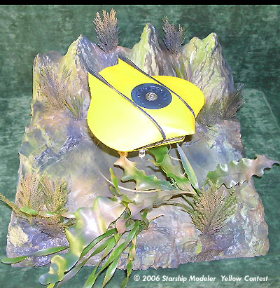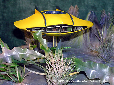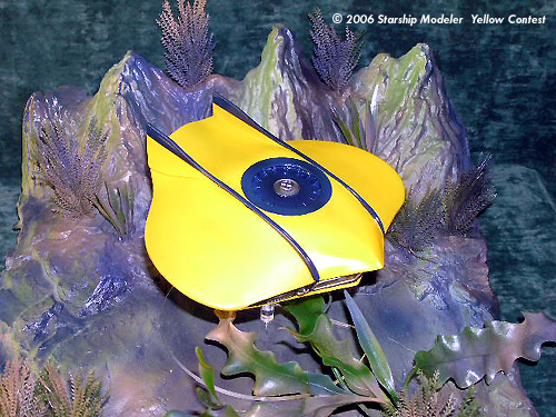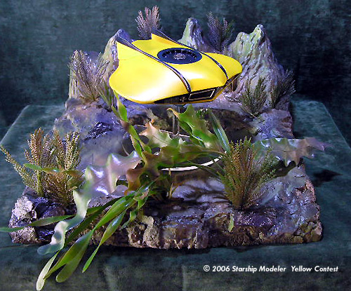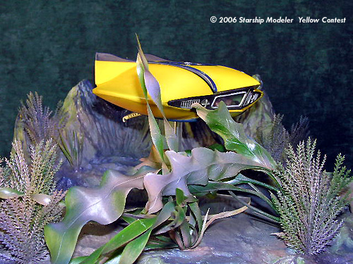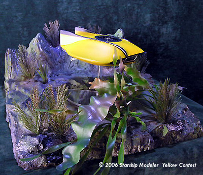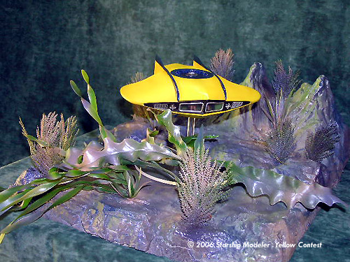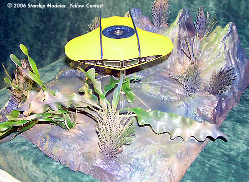 A static build of the 1/65th scale Monogram Flying Sub hovers the Diorama of an undersea seascape of my own invention. Using some different scale aquarium plants, and the diorama base I use for many of my projects, I got an interesting "Voyage to the Bottom of the Sea" display. An acrylic/lexan rod assembly minimizes the support's impact on the "hovering" craft effect. From some angles the illusion was quite good. The base was airbrushed with a variety of specific aquatic colors to get that "60's" feel to the tiny set design