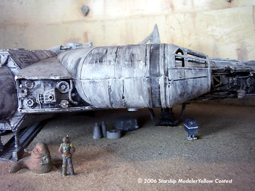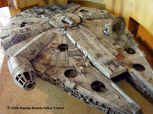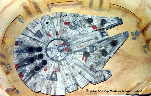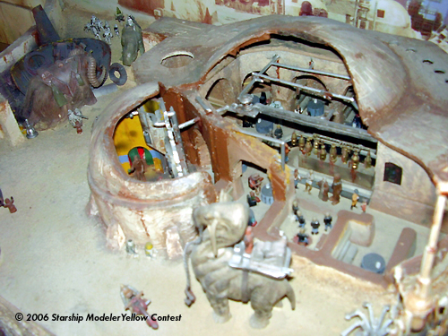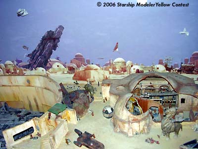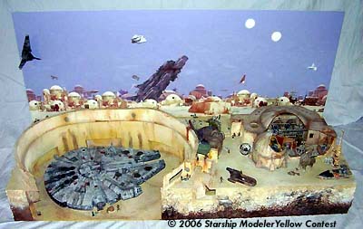 The diorama features the following model kits and toys: MPC Millennium Falcon (modified from stock kit). Cantina Model kit x2 (modified from stock kit). Micro Machines Luke's Landspeeder, Lars Landspeeder x2, Ronto, swoop, many left over greeblies from various model kits (X-Wing, tie fighters, B-wings , etc.)