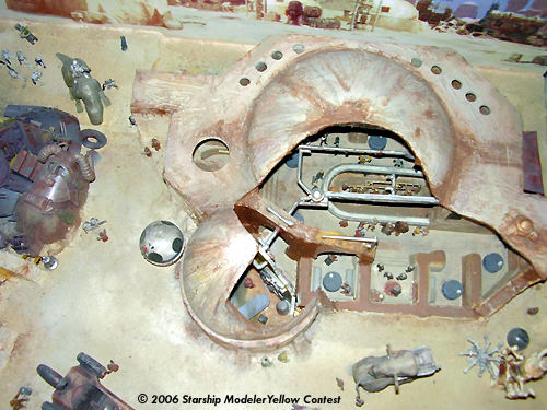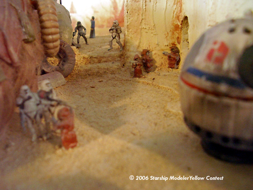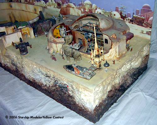 This Diorama is aprox. 48" long 24" tall, and 17" deep. The main structures include the following materials. Dibond, wood, gatorboard, sintra, pint and caulk (stucco walls). The background is a wide format laser print from a custom file I produced in Photoshop. Multiple sources were used to create the background including, but not limited to: Screen grabs from Star Wars, Star Wars: Behind the Magic CD ROM, and actual photos of buildings in Tunisia.