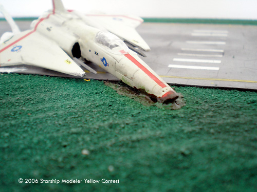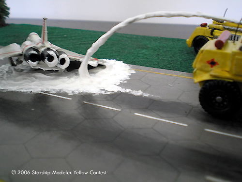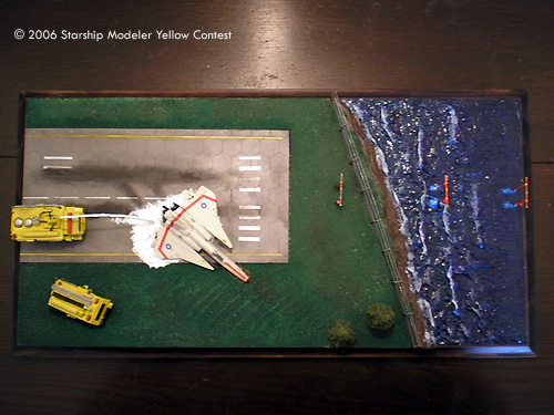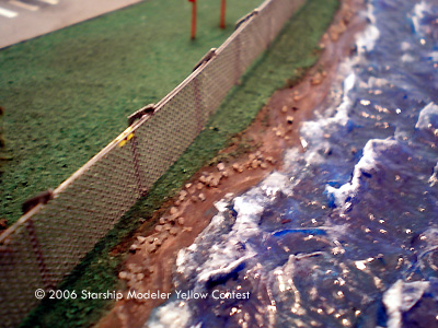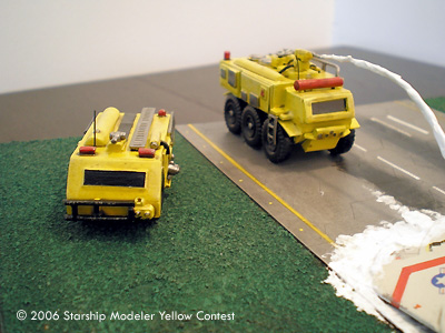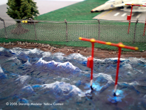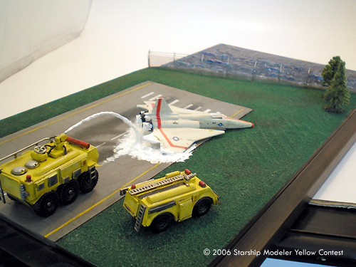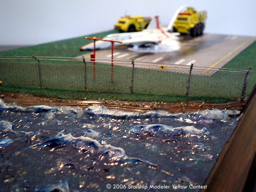 The principal tie to the theme are the yellow crash rescue appliances. The appliances are scratch built with the wheels coming from a 1/72 truck, just right for a fire truck. The crashed plane is a 1:144 Lee F-20 tigershark modified to look like technology 50 years from now, heavily influenced by the new BSG. The wings are scratch built and an extra pair of engines are mounted. The runway is hand scored styrene, the grass is painted sand and the water build up slowly with layers of Liquitex gloss gel medium and blue pigments. This was also used for the fire fighting foam, but with white paint. The trees are railway scenery but the fence is scratch built from wire and fine wire mesh.