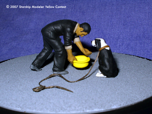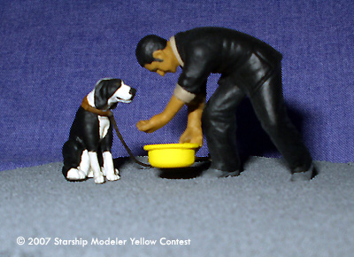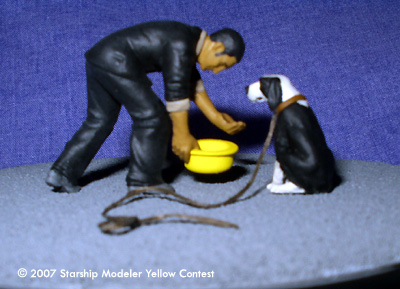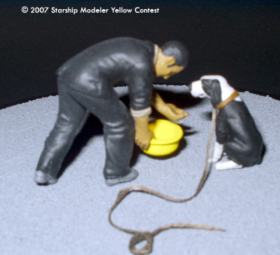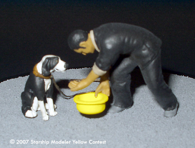 In this vignette, inspired by scenes from the Battlestar Galactica third season premiere, Felix Gaeta offers water to a dog in a bright yellow bowl. Following the Cylon occupation of New Caprica, Gaeta-a Baltar administration insider-leaked secret Cylon plans to the resistance, led by Col. Tigh and Chief Tyrol. The position of the yellow dog bowl was the signal Tyrol used to communicate with his anonymous source.