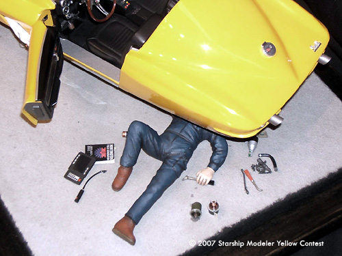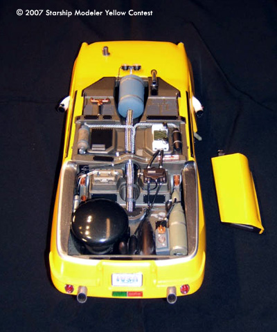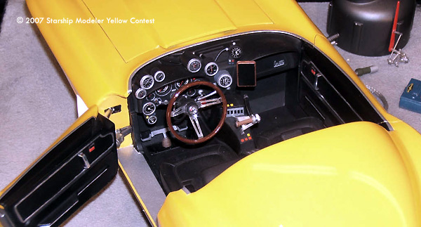 Tons of balsa and Magic sculpt later I had smooth clean body to attach all the fun stuff, but first I had to paint it. Years ago I came to the conclusion that only “great” sports cars look good in yellow…so yellow it was. 8 coats of Testors yellow, cure for three weeks, and then start polishing. After 12 hours of off and on work I was happy with the shine. The interior was done in black to accent how YELLOW the car was, and to help set off the gauge faces.