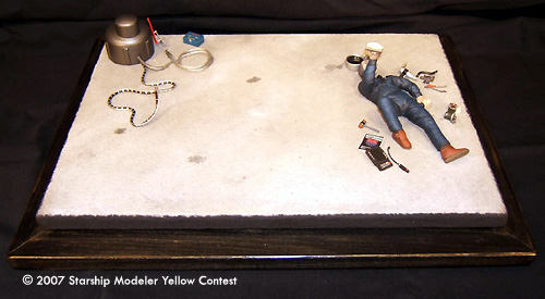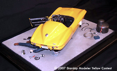 This model started life as a 1/12 scale Monogram 1967 Corvette split window bought at Wal Mart. I knew what I wanted to do with it so I started sketching ideas for the diorama and the specific systems on the car. I kept flashing on a vision of the dashboard bristling with analog gauges and wires, so that was where I started. To get the best view of my “dream dash” I knew the roof would have to go, but I LOVE the teardrop back of the '67' so as a design feature I knew that had to stay…so off went the windshield (field generators keep you safe!), the roof, and the rear windows got filled in. I decided to open a door so the viewer could see in and get a feel for what it would be like to be at the controls.