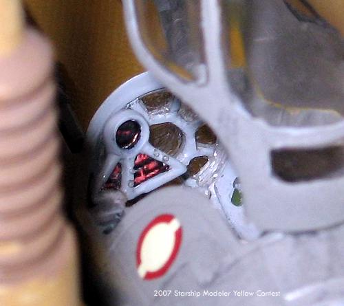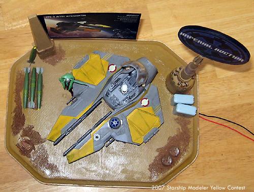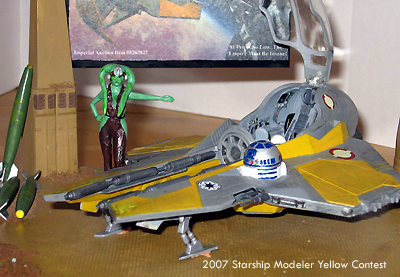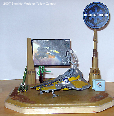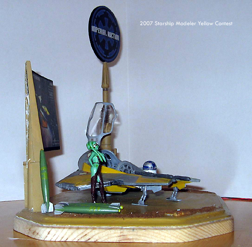 The model is an AMT/ERTL Jedi Starfighter, made to represent Anakin Skywalker’s yellow starfighter. A scratchbuilt targeting computer uses a picture of the device shrunk down and glued to the plastic. The landing gear was a mix of gear from a SW snowspeeder (front legs) and a ST Romulan Scorpion model (back leg). The Twi’lek “Vanna White” is a modified swimsuit figure from a 1/24 scale car accessory kit. She sports an outfit made from aluminum foil. The Imperial Auction sign was constructed from the exhaust nozzle of a 1/32 scale F-16 and a STAP laser barrel. The auction advertisement (which came out rather poorly in the photos) was made from pictures found on the Internet. The bombs were extra ammunition generously provided from the same 1/32 scale F-16 model.