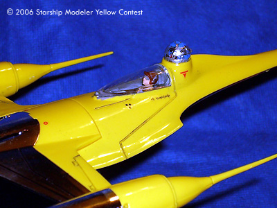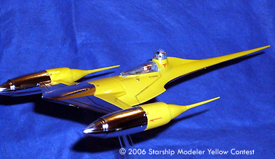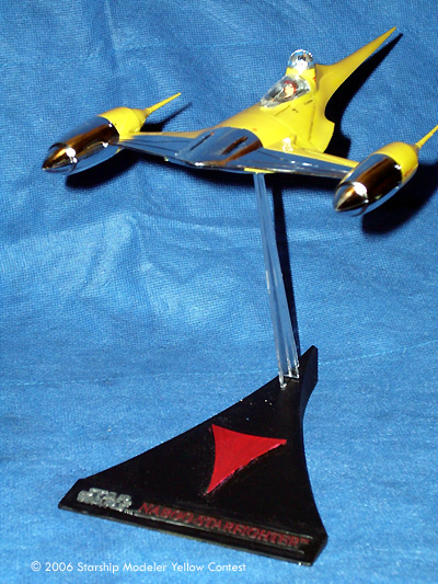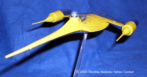 This is the Naboo N-1 starfighter. This is also my son Jared's very FIRST model kit (he is 10). It was a snap kit that we had laying around for many years in his closet. Star Wars Episode One was the very first Star Wars movie he ever saw, and then watched them in chronological order. It was his favorite until he got hooked on the "Clone Armies". I guess the rest of us were very cynical of the film, but to him, a 9 year old hero was VERY cool!