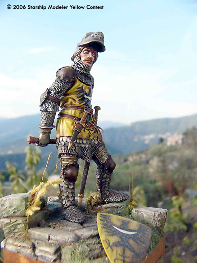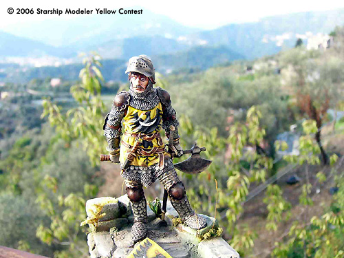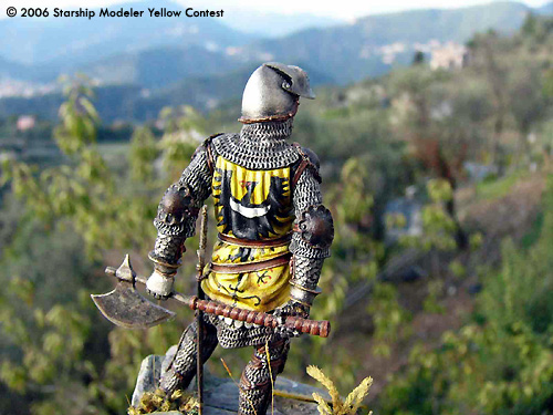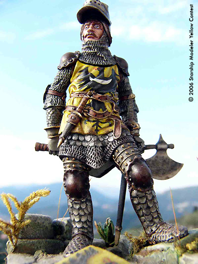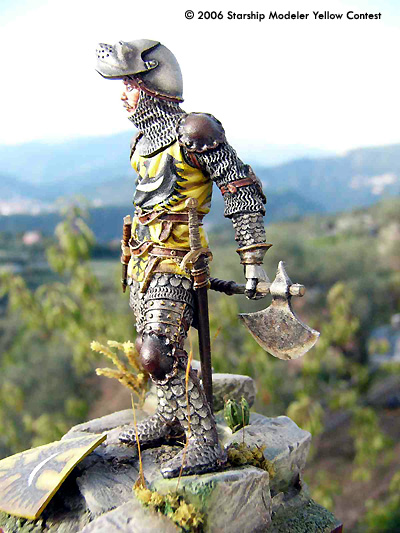 The colors, after a light primer coat, are acrylics - in some points- and - mainly- oils, plus many and many washes made in various days. The terrain of the base is scratchbuilt.The helmet and the armor have been slightly modified to make the figure appear more aggressive and warlike.The setting of the photos is placed just in the valley outside my window...