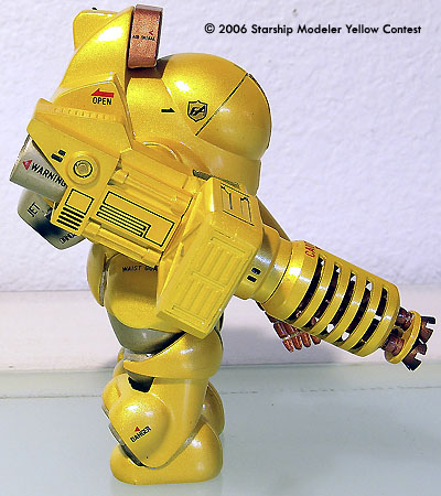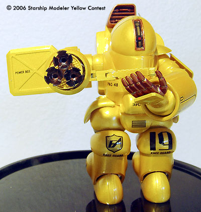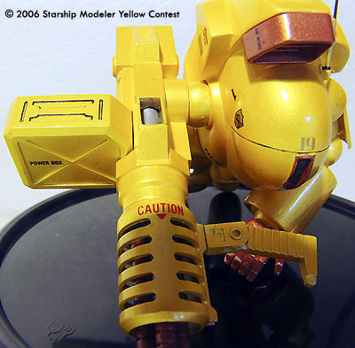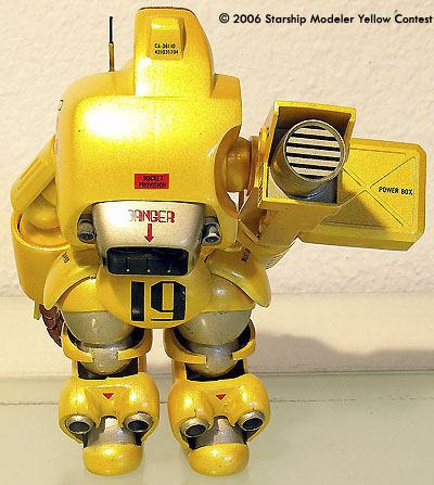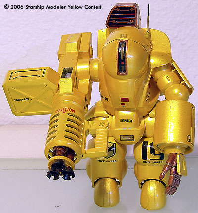 This is Gunze-Sangyo's Machine Soldier Dorvack PAC-48G Doldian . It was built long ago and far away when my wife asked me why I always paint everything so beat up. So, I painted a bright yellow one.
