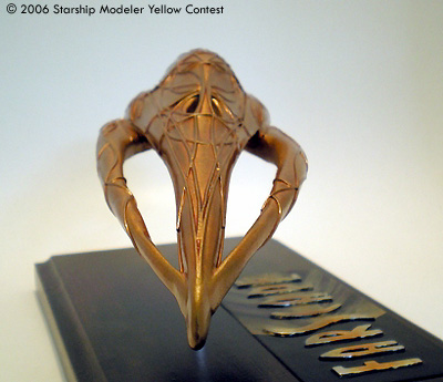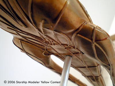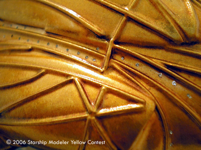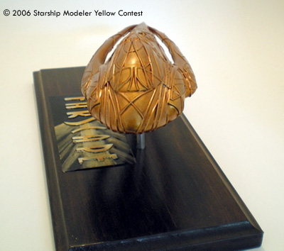 This model is made from styrene over a balsa wood core, and resin arms. The ridges are a mixture of styrene half rods and soldering wire (very flexible but delicate) The paint is Citadel “shining gold” and chestnut ink all air brushed on. The windows due to scale were drilled and painted “mithral silver.”