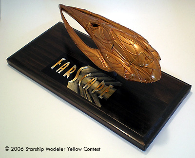 The base is hand made, stained pine and the plaque is three dimensional from styrene shaped to be the opening title. All is covered with Future. (I have found that future works fine on wood if several coats are applied and plenty more patience is applied to the drying time).