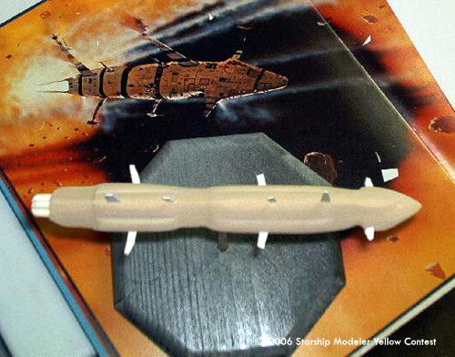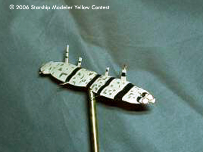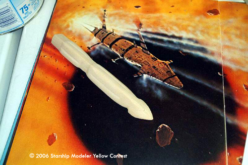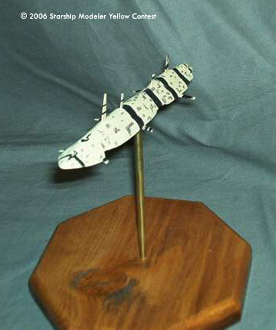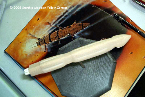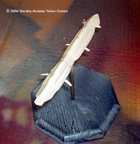 Once I had the shape, some very careful sanding knocked down the sharp edges, and a single large gun port was added to the nose. Three short styrene tubes were used as engine tubes, and all the fins were cut from thin sheet styrene. Yellow paint made a close match to the ship in the painting, and then flat black acrylic paint made up the striping. The hull panel detail came from a Prismacolor Gray marker.