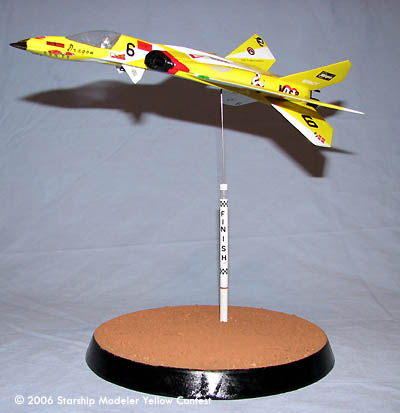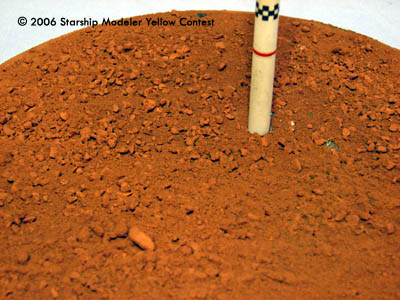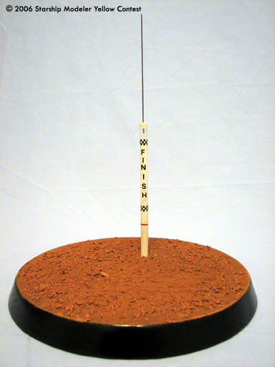 The stand was made from a piece of wood cut out with my scroll saw, a piece of acrylic rod and a piece of high tensile wire from an old balsa wood bi-plane kit. I painted the base black, masked the sides, then spread dirt and small rock over white glue for the ground. The finish line pole was painted white leaving the clear lens between the checkerd flags for a 360' camera.