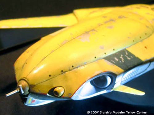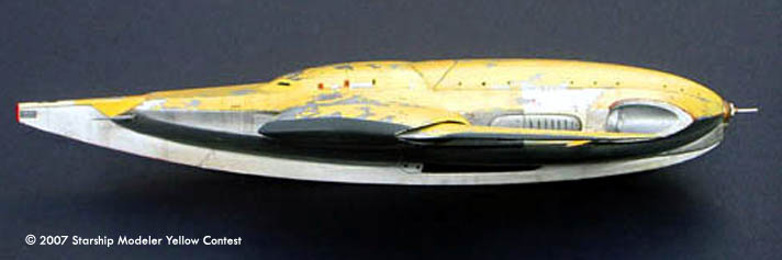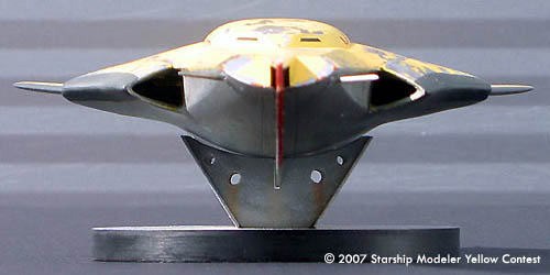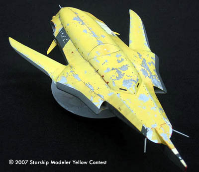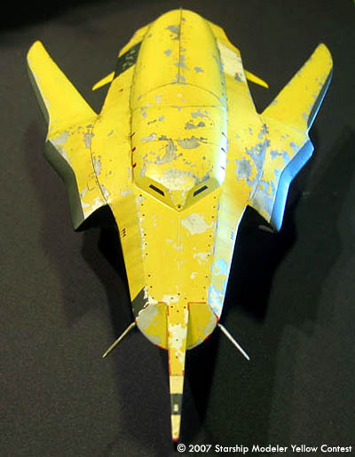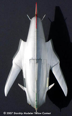 The model is 1/72 scale, and measures 225 mm (9 in) in length. It's a compete scratchbuild; the flat surfaces are sheet styrene, and the curved pieces were made with balsa forms, then cast in polyester resin. It's a variable geometry model--the wings are geared together and swing through about ten degrees. I've ripped the paint up pretty good: a few hypersonic reentries will do quite a number on the finish.