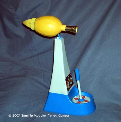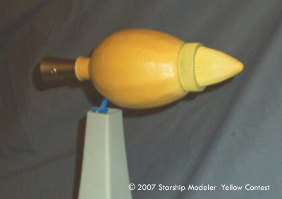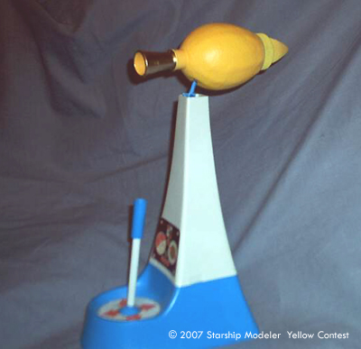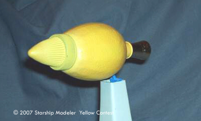 To build the model, a plastic lemon juice bottle was hunted down, purchased, drained, and cleaned. A child's paint marker pen cover provided the engine exhaust, and the nosecone was a resin casting from one of my earlier shape duplication efforts.
