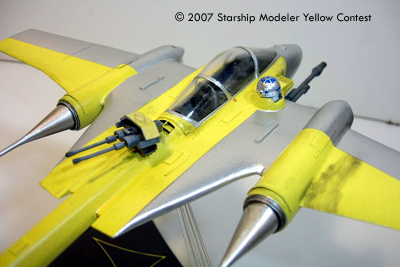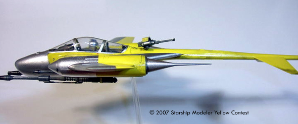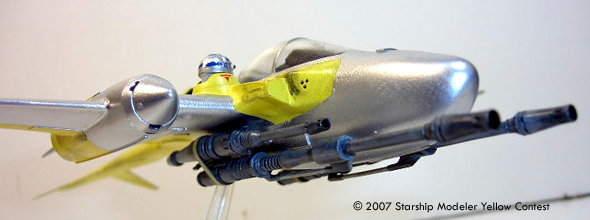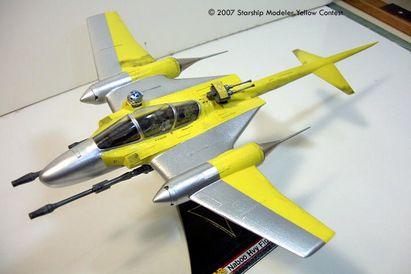 After the war with the Trade Federation wound down, the Naboo high command's battle analysis revealed that the N-1 fighters where totally ineffective against the newer, heavier fighters and capital ships in current use. Used primarily for policing the Naboo system, they where badly outdated. Since the new heavy fighters where very expensive, only three squadrons where built; these saw extensive service in the Clone Wars protecting Naboo against several attacks. Armed with quad forward-firing turbo lasers, the N-104 Heavy Fighters can be a serious threat to all but the most heavily shielded capitol ships. Since the fighter has to make a fairly slow attack run, it can be an easy target for defensive fighter support. For anti-fighter defense, the usual behind-the-cockpit droid socket has been replaced with a twin laster turret.