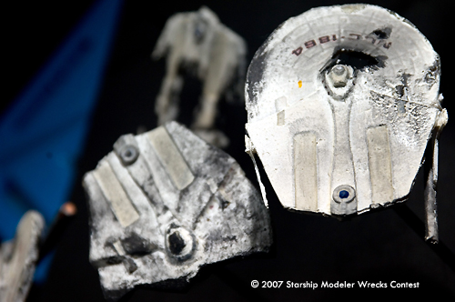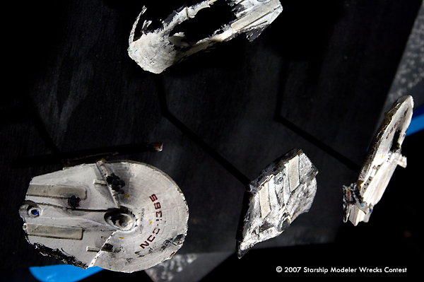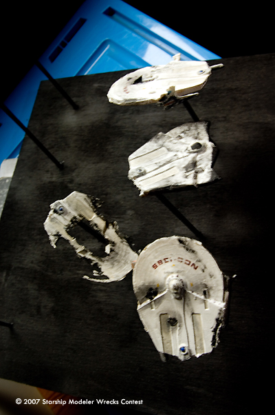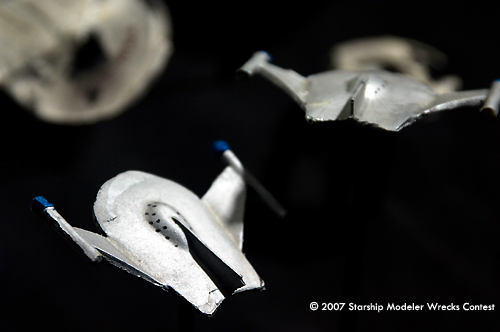 This convoy attack was put together with two Romulan Bird of Prey kits from RBM Models and some very poor mis-cast Miranda class hulls. The Romulans were given a non-traditional paint job to try and give them a slightly updated appearance. The Mirandas were all painted a very light grey and decaled before being heavily weathered and given a black wash. I then cut a number of 'hobby sticks' to various lengths to give the display a three dimensional element and embeded them in a wooden base. Then, I painted the whole base assembly black before mounting the ships on them.