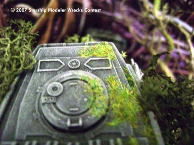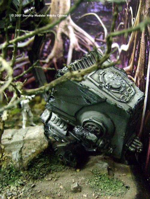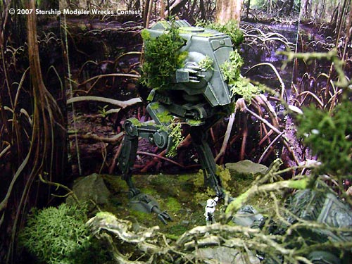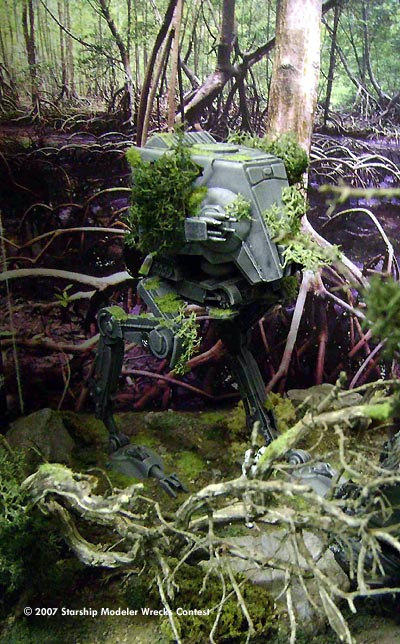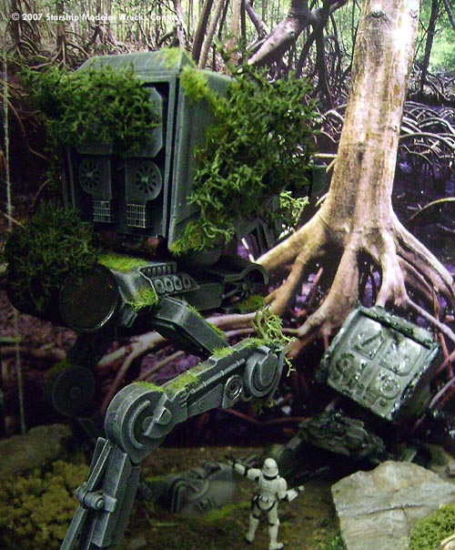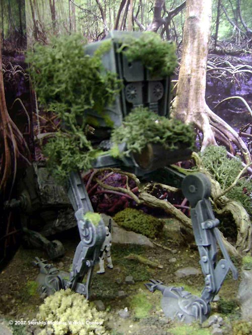 The primer is the "traditional" Chaos Black from GW , useful also on plastic not only for game miniatures, and the colors are Vallejo acrylics with oils for the weathering. The diorama was made with chalk, rocks, lichens, flock, little pieces of a real tree as well as drybrushed, dust and pigments on the surface and cardboard all around. The "head" of the wrecked mecha on the ground has been damaged and battered to show a partially burnt remnant of an AT- ST destroyed by the Ewoks who - in brief time - discovered how to attack such a powerful machine using natural weapons like enormous trunks of the forest, stones, fire and so on...everyone knows how the story ended and the Empire was finally defeated!"