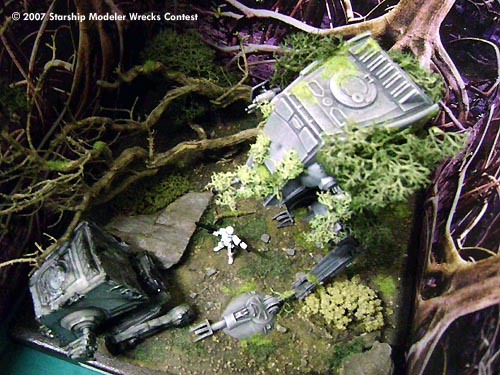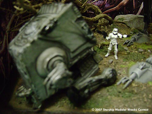 But the evidence of that wreck on the ground showed all the fierceness of the attack, every part of the turret seemed have been put on fire and the legs of the AT-ST were only two destroyed remnants burnt all over. No use of laser guns or any other modern weapons, only flames, maybe fire...something that even those furry creatures of this Moon could be able to do, after all.