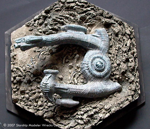For painting the body of the derelict I used colour from Revell. So the basic colour was dark grey, second a dry brushing with medium grey and washing with rust. Finally I did a dry brushing with light grey and little sepia dust from the planet's surface. For the landscape I made a thin washing with watery wall-colour umbra/black and a finish dry brushing with sepia-grey.