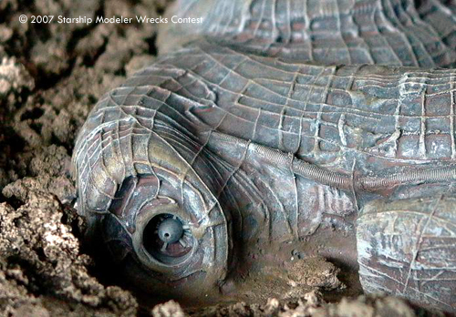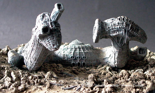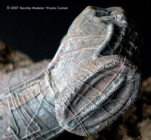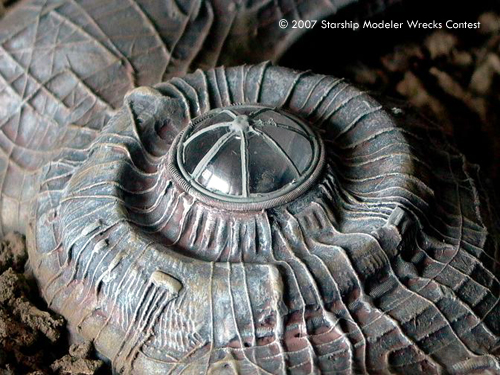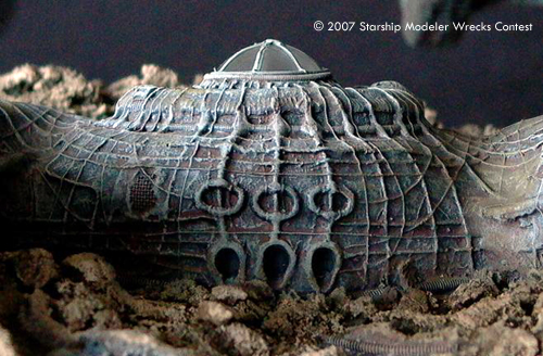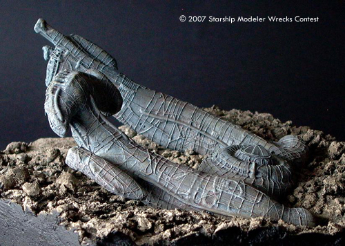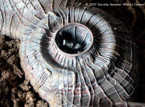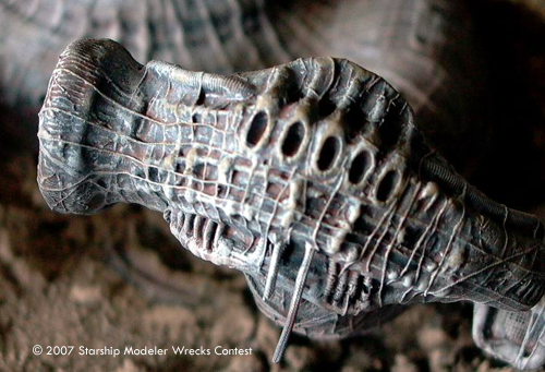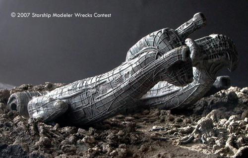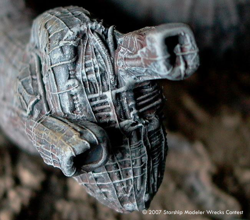 In the movie, the derelict was simply still laying there in the landscape. So what happened? My imagination was an accident, made from this crazy alien in the chest of the dying pilot. So it must be an impact... Or isn't it? (And of course the planet lv-426 is not the home world of those terrible beasts.) So I put the body of the ship as if it had rammed down on the planet's surface, with the front of the derelict filled up with heavy rocks.