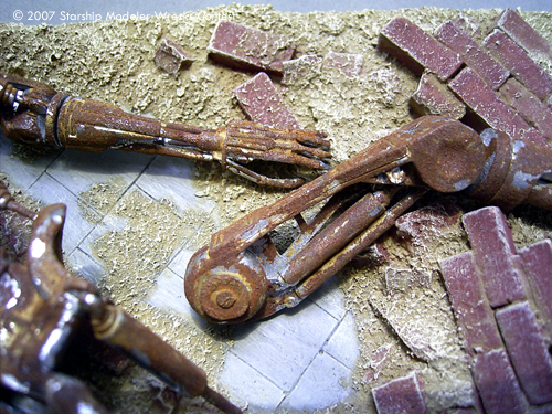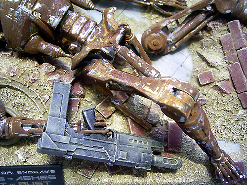 The T-800 was painted chrome silver, than heavily treated with the “real rust” stuff. The weapon was painted Black Chrome (Testors), drybrushed with Bolt Gun metal and weathered with Tamiya Weathering Master “Sand”. The Quntadim-Wave only affected the endoskeleton alloy, so the weapon isn`t rusted, only covered with dirt and dust.