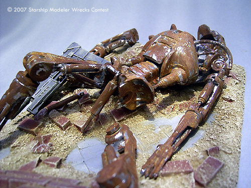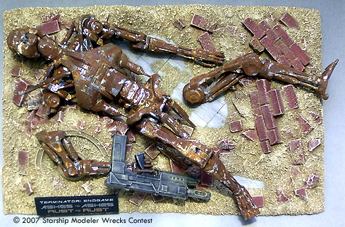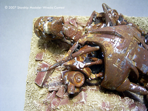 This model is build from an old styrene T-800 model I had lying around here, waiting for massive re-work regarding the paintjob, and a resin casting of a scratchbuild groundplate. Well, the wrecks-contest was the perfect reason to test a liquid “real rust”-set I got on an exhibition a while ago. So I broke the endoskeleton into several pieces that looked like being ripped apart by bullets or a small explosion, and while I set the scene into a time twenty years after the destruction of that Terminator robot (and the whole Skynet system) I used a lot of rust on it.