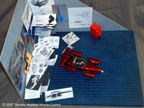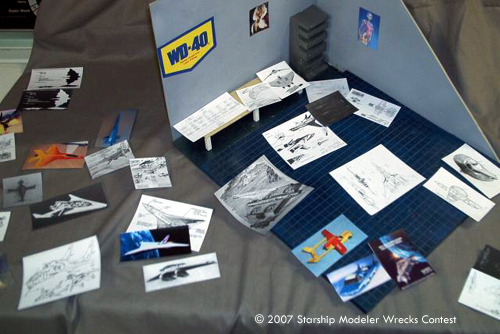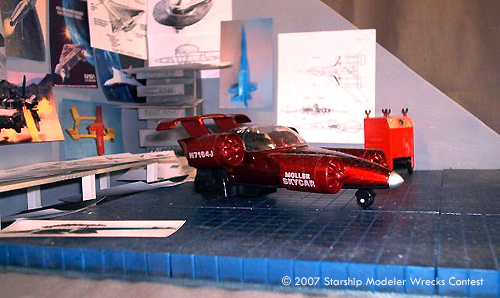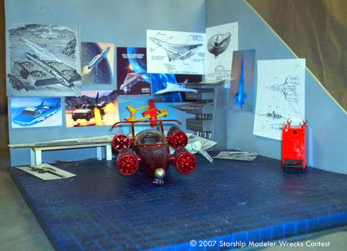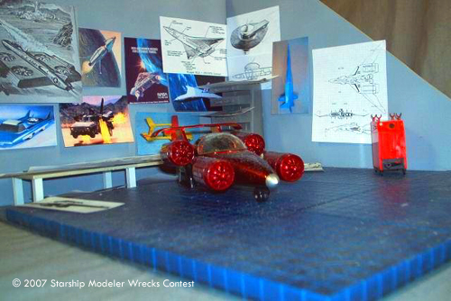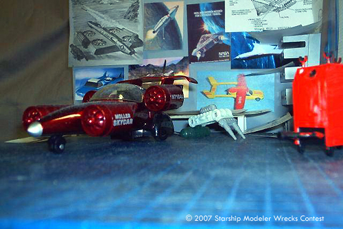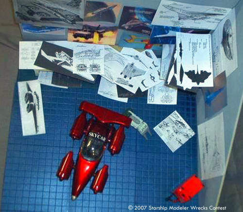 I took a M400 Die Cast Model that I'd ordered from Moller International, and set it into a garage that had been previously built. I then took many, many aviation, video game, and aerospace images that I'd gathered over time and started printing them out, usually in a business card size format. These were carefully sorted for impracticality or sheer nonsensical value, such as the NASA recruiting poster, the Bel Geddes Airliner, or the Corgi Toys Junior E2009 James Bond Aerocar from1977. They were carefully strewn around the diorama, and then for the final touch, some clean laundry lint was shaken over the Skycar to simulate scale dust.