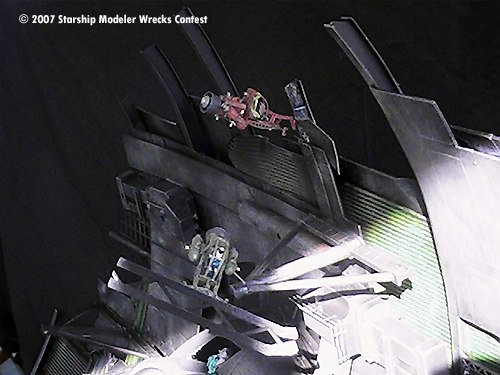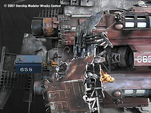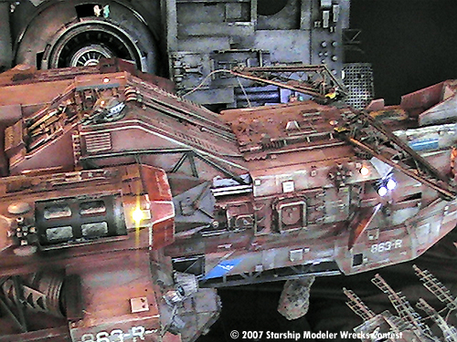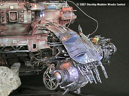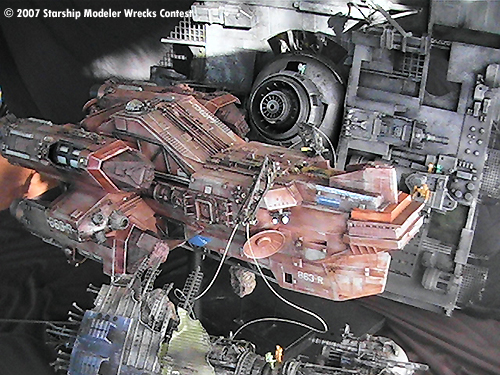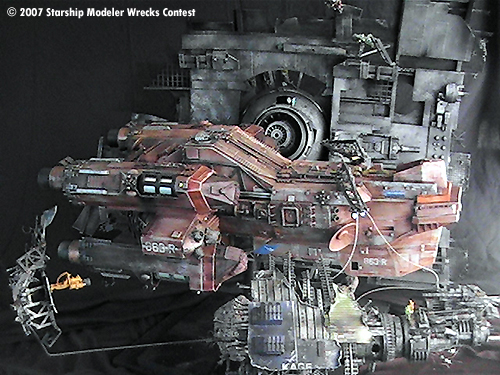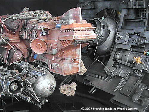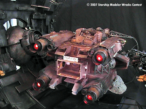 The “Junkyard Dogs” diorama is really several models. The Vagabond is a ship I started for an independent production about 2 years ago. When the project went on “indefinite hiatus” I ended up with a mostly finished studio scale-type starship. Since I was given a free hand to design and build her as I saw fit I was always looking for a reason to finish and display her. Then one day I hear….”hey honey, there's a “Wrecks “ contest” …. and away I went.