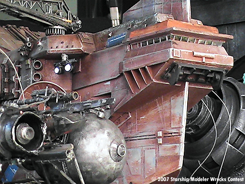 All engine and running lights are Hi-intensity LEDs as are the mini work floods under the cranes. The bridge [which is fully detailed and has 4 crew members at in various work positions] is lit with three small Krypton maglight bulbs. All the lights are powered from an internal battery power supply located under the upper rear deck. Lots of odds and ends from the parts bin were used to detail the whole thing out. In fact, there are only two custom castings on the entire thing. The small attitude control thrusters and the large power converters at the front of the engine nacelles were both resin casts of master forms made from styrene.