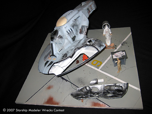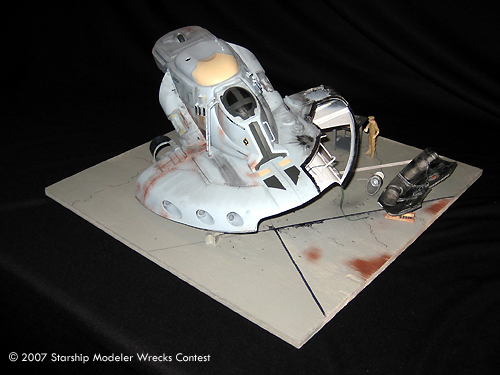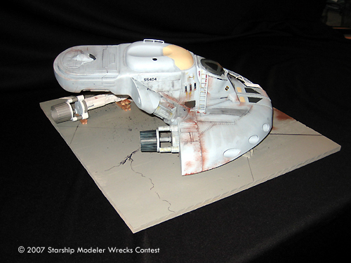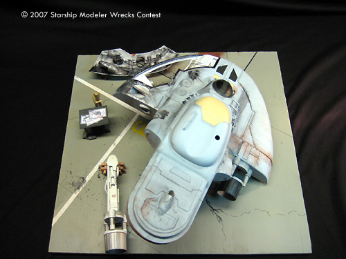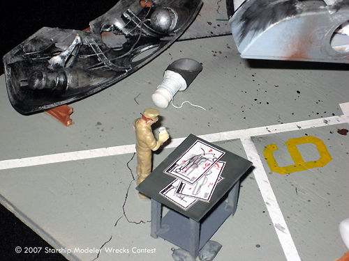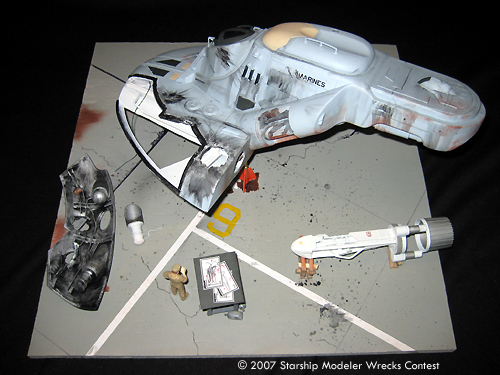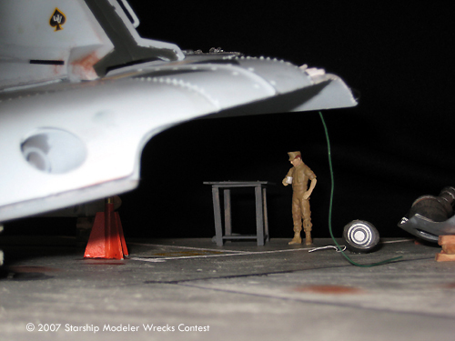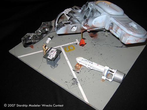 One of the things I thought of when I heard about the wrecks contest was that it would be cool to do up something high-tech “up on blocks”. I knew I’d need a base, so I started with a 14x14 piece of 3/8” plywood. This was painted grey and then weathered using rust and flat black paint. Cracks in the concrete floow were drawn on using a sharpie.