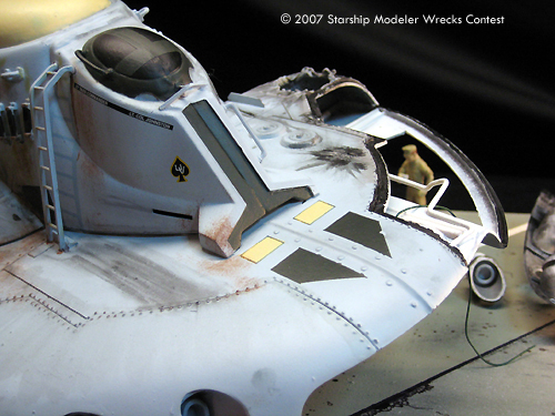I chopped off the side cannon spars and patched the holes from these guns and the turret mount with sheet styrene in order to smooth the lines. I added a set of engines, cockpit ladder, and some greeblies, and then proceeded to putty, sand and paint. I deliberately kept the fitup on the forward thruster cowlings rough because with all the exposed rivet heads, it seemed to fit better.