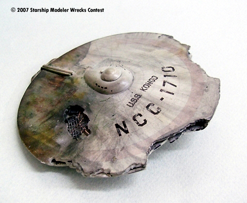 The saucer is from Polar Lights 1/1000 Enterprise Kit. I built the saucer pretty much stock, then cut up the front with a razor saw. I painted the hull Testors camouflage grey.