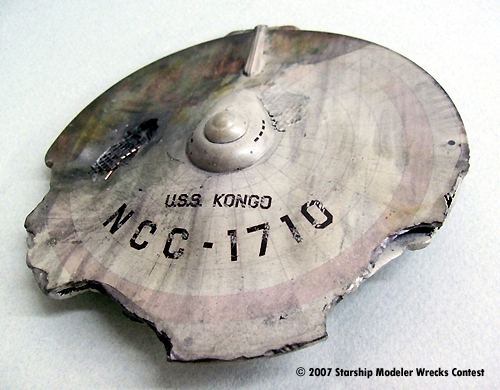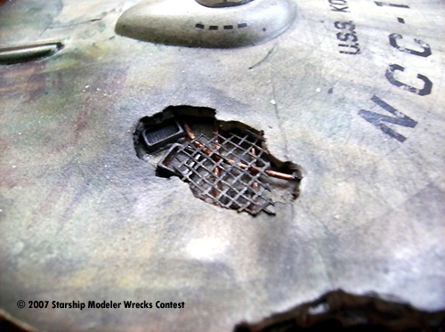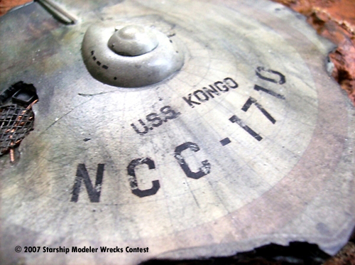 The hole in the hull was backed with sheet styrene. I added some Wave detail parts, copper wire and mesh screen for some detail. Weathering was done with pastels and washed on top of the decals that were dull coated. Since the Kongo experienced some sort of powerful dimensional weapon, part of the grid is missing. I wanted to simulate that a layer of the hull skin had been ripped away. Weathering consisted of streaking gray pastels across the hull and layering of pastels for the right side damage. Once the weathering was done and pastels sealed I mounted the hull onto the base with more Ultimate.