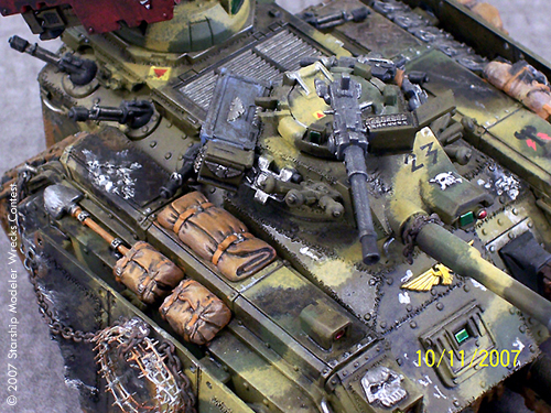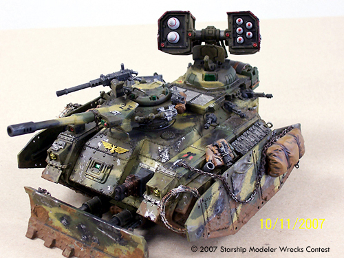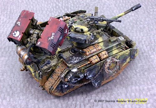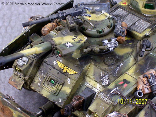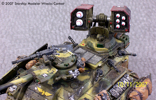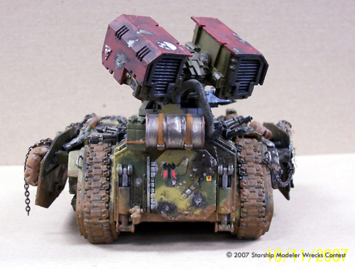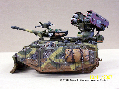 The model started out as a Chimera Tank from Games Workshop Warhammer 40k. But I wanted to do a little something different, so I added the Whirlwind Tanks Missile System also from Warhammer 40k to make the Scorpions “Tail”. I also added a lot of detail to the kit such as weld lines on the armor plates, gear - packs, gas cans, chains, and barbed wire, also along both sides I added extra armor panels to give added protection to the tracks. As you can see on the right side toward the rear a devastating hit took out the last third of this extra armor.