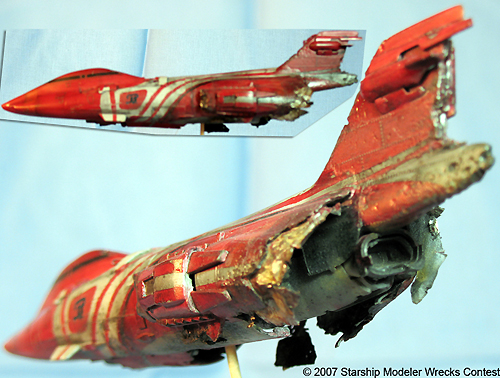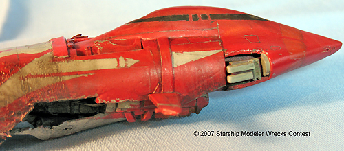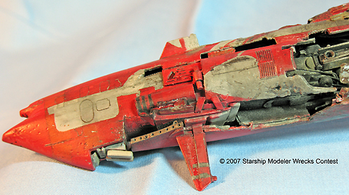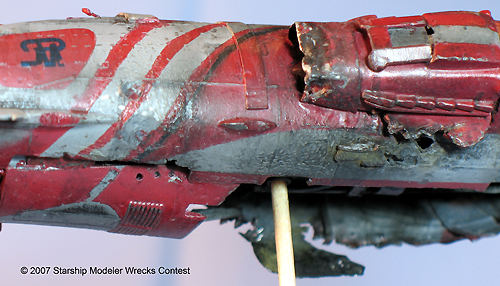 The paint scheme and the ship's name pay homage to two illustrators that have influenced my in my own illustration work; Peter Elson and Chris Foss. Weathering and aging was achieved with pastels and washes. The damaged areas received some real soot staining from burning sprue pieces close to these areas. I used the foil from wine bottles for the bent and twisted metal. Also, three different sized cutting bits in a Dremel tool were used to tear up parts of the ship.